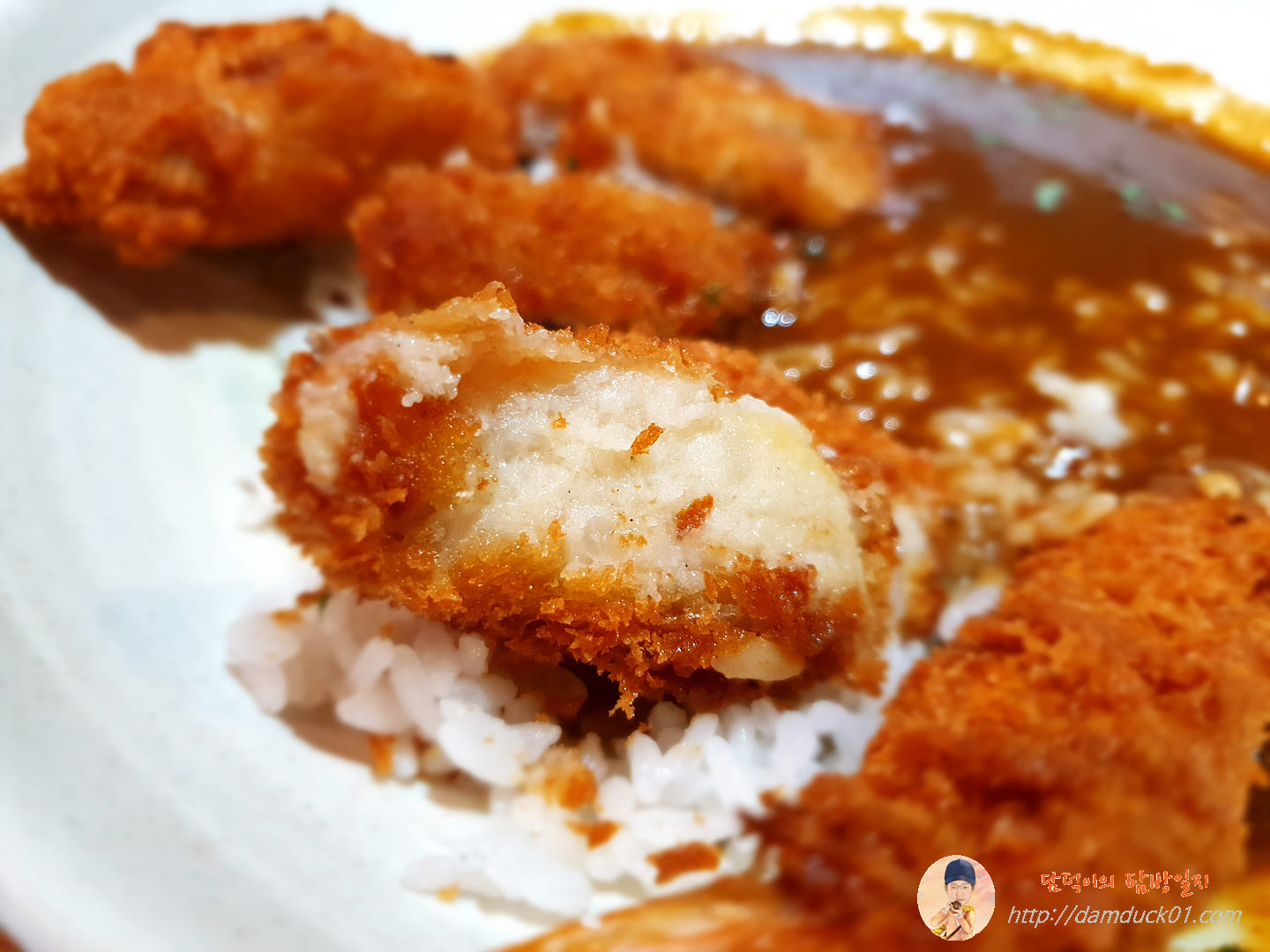 새우튀김은 카레에 머리를 살짝 담그고 있네요.