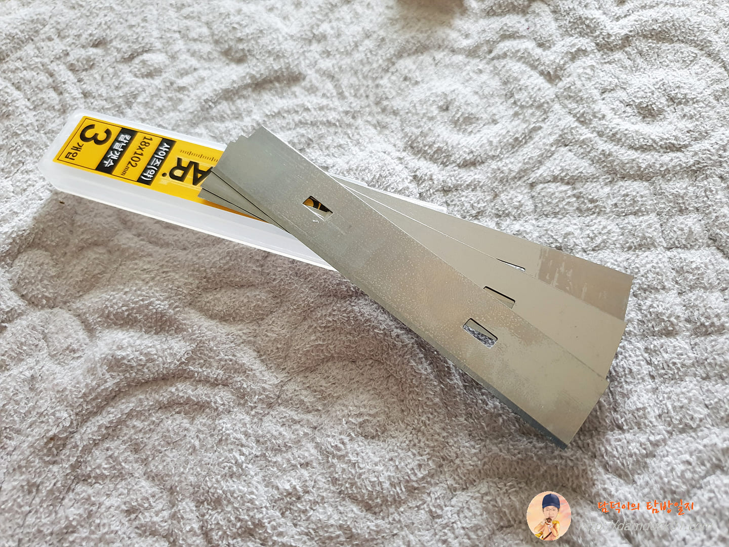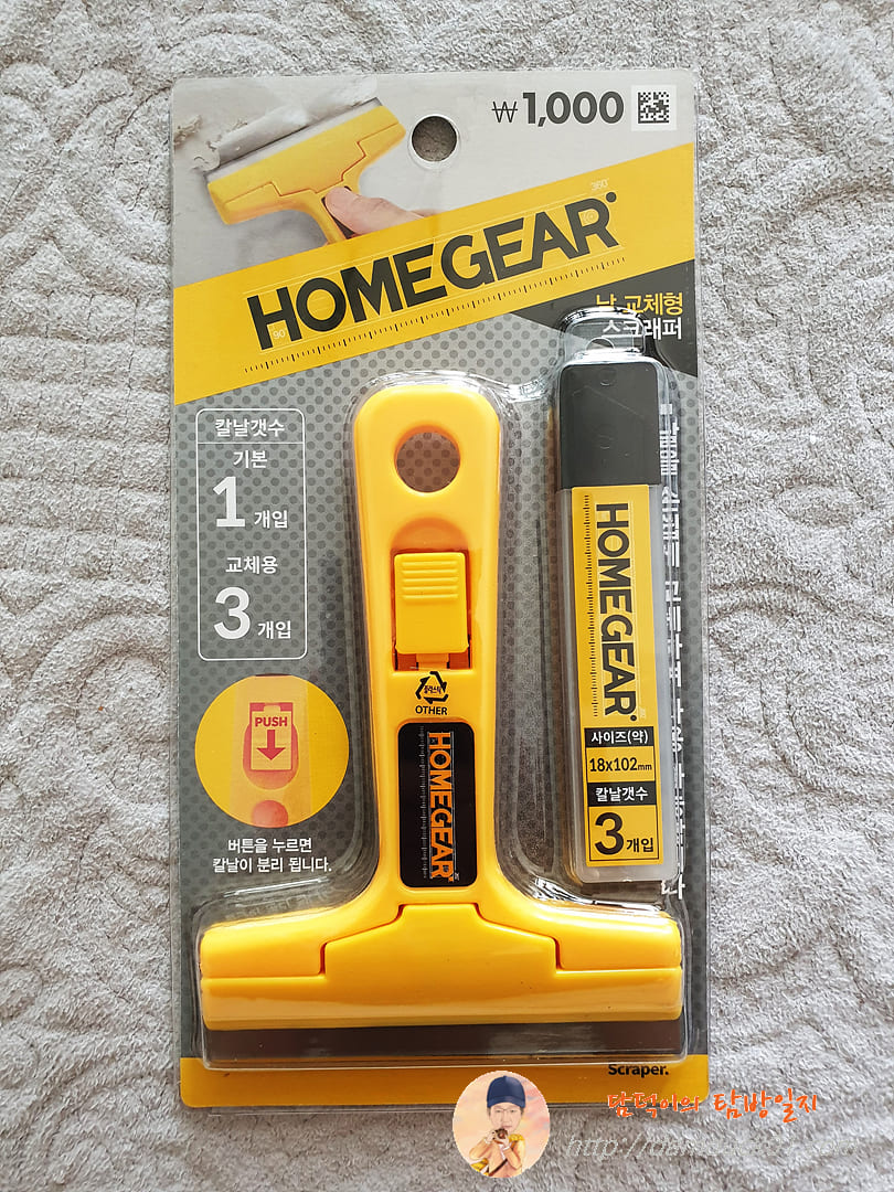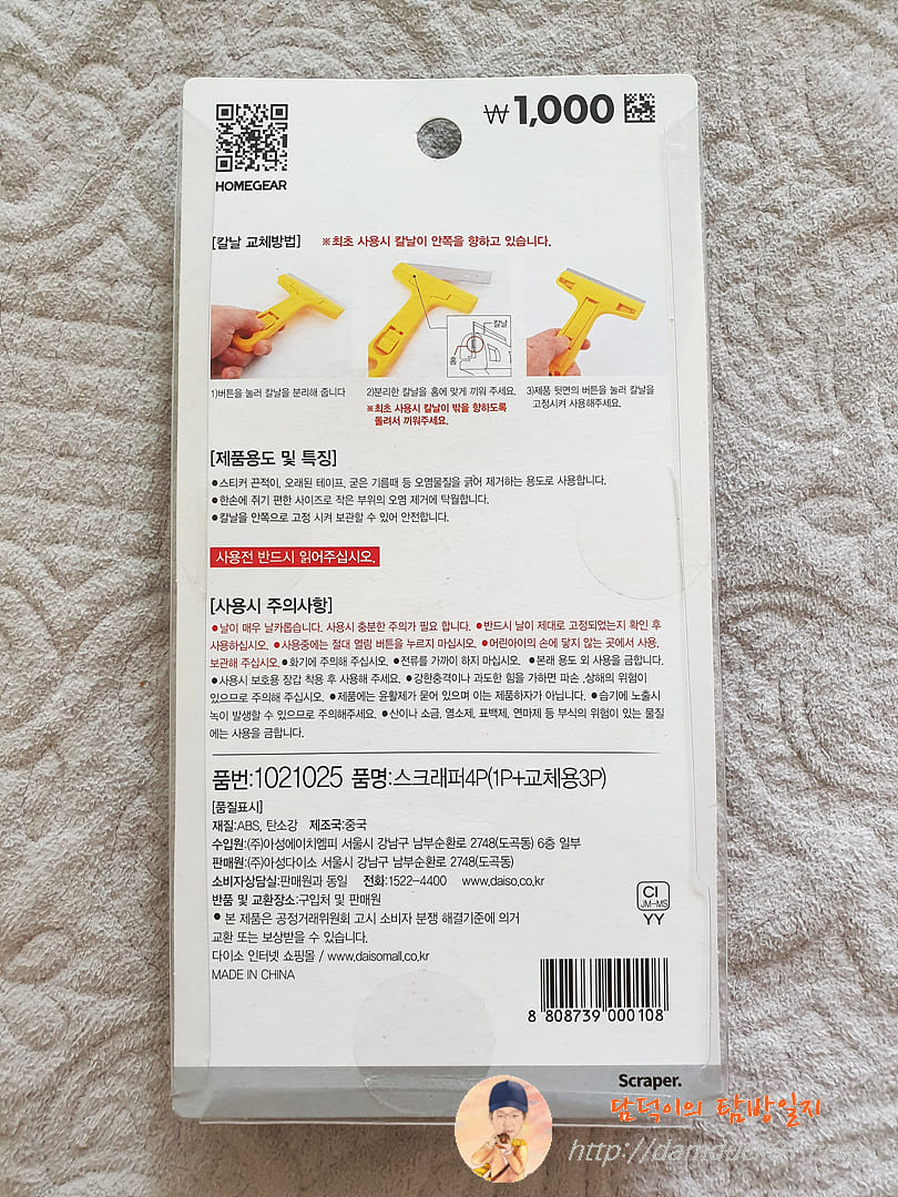 적혀 있기는 스크래퍼라고 되어 있는데 헤라라고 부르기도 하는 거 같아요. 다이소의 1,000원짜리 스크래퍼 구성품을 살펴볼까요. 날이 결합되어 있는 스크래퍼 하나와 여분의 칼날 3개와 별개의 보관함에 담겨 있습니다. 그러니까 총 4개의 칼날이 포함되어 있네요. 역시 다이소의 가성비인 걸까요?