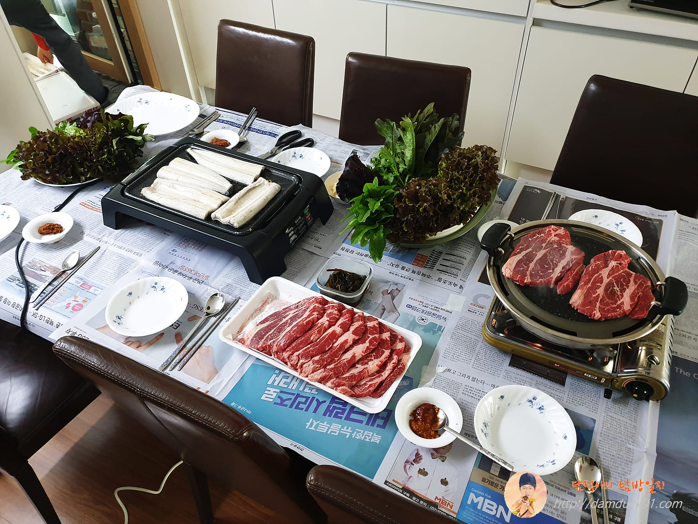 부모님이 준비하신 소고기 두 덩이 올리고 아내가 주문한 초벌구이 된 장어도 불판에 가득 올렸습니다.