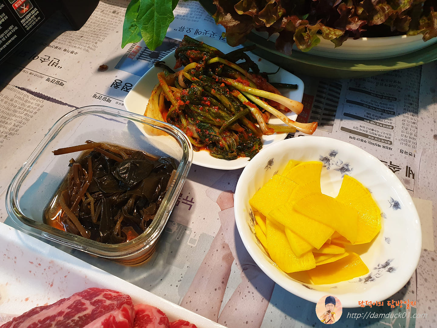 어머니가 직접 만든 단무지와 열무, 파김치 그리고 나물 이름을 모르겠네요.