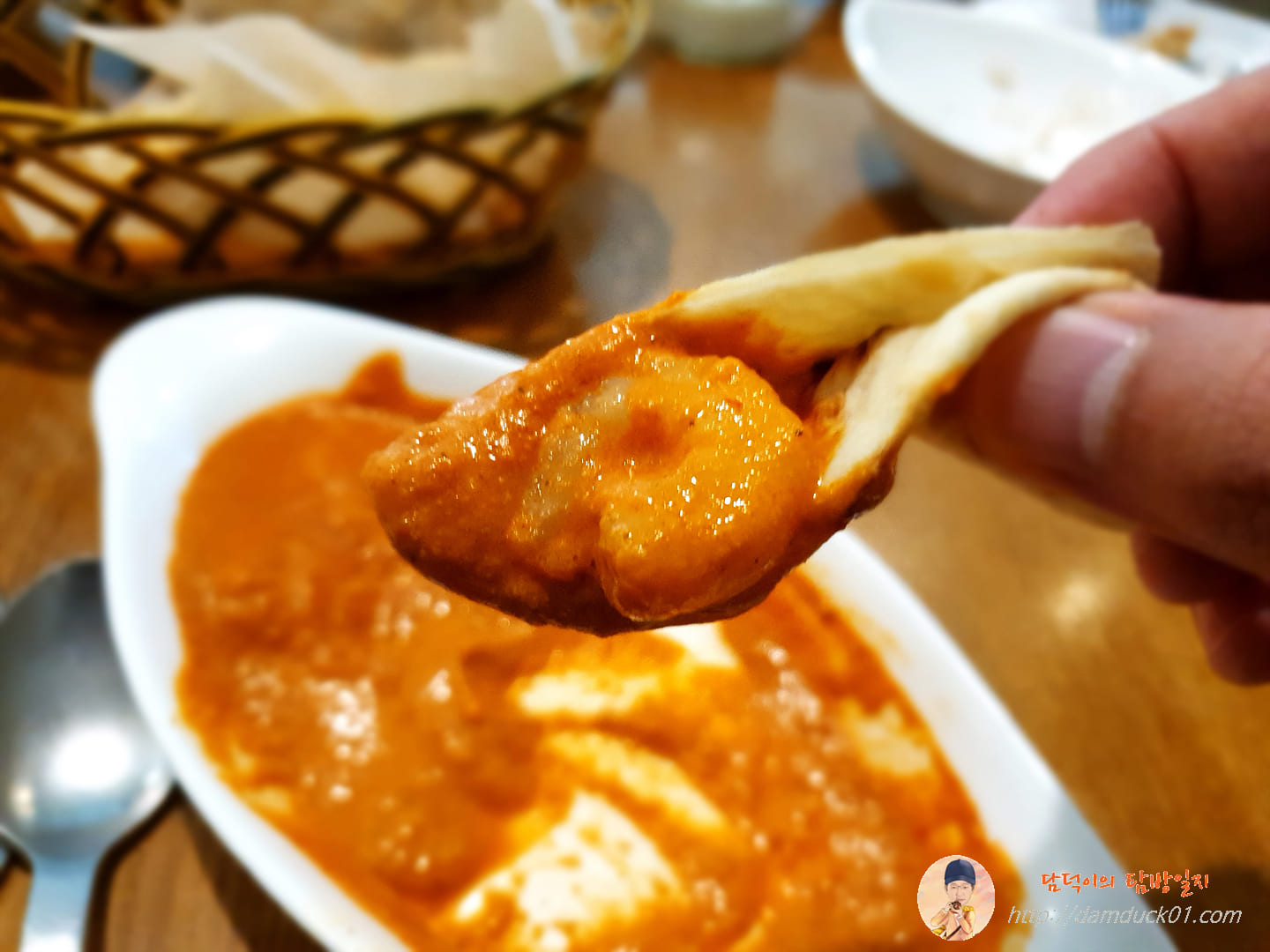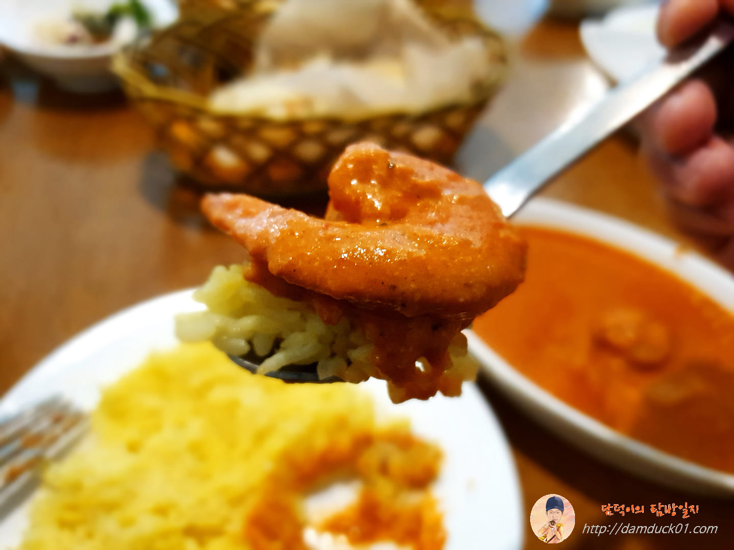 저는 강황 밥이랑 커리를 먼저 다 먹고 난을 커리에 찍어 먹는데 새우가 4마리니까 강황밥 먹을 때 두 마리 먹고 난 먹으면서 남은 두 마리를 먹었답니다.