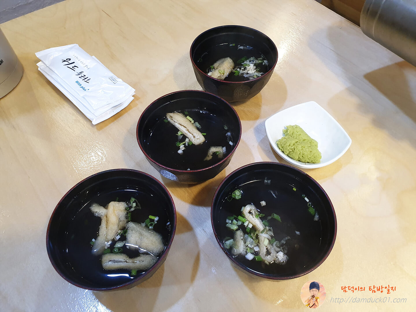 주문을 하고 나면 가장 먼저 나오는 건 장국과 생와사비 푸짐하게.