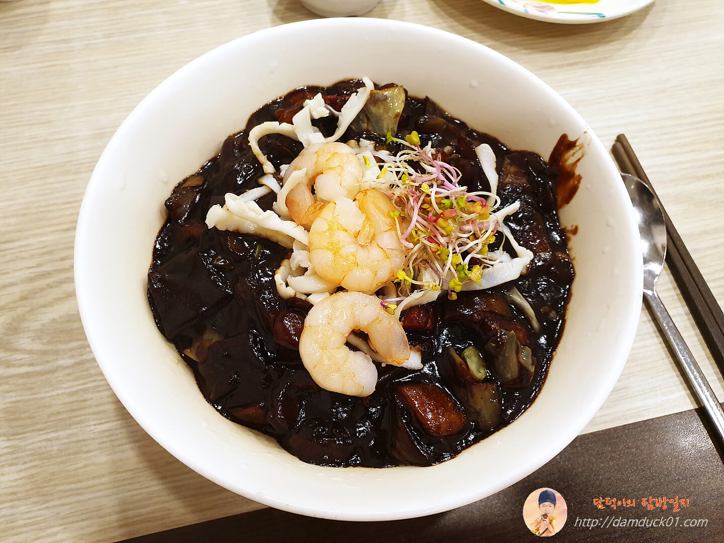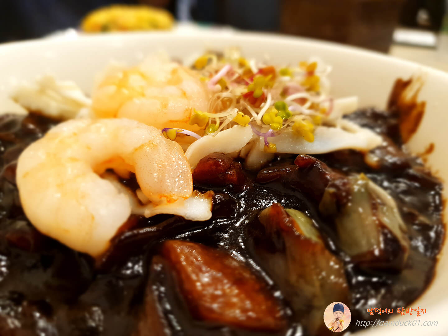 짜장 위에 새우와 양배추 그리고 새싹이 얹어져 나왔어요.