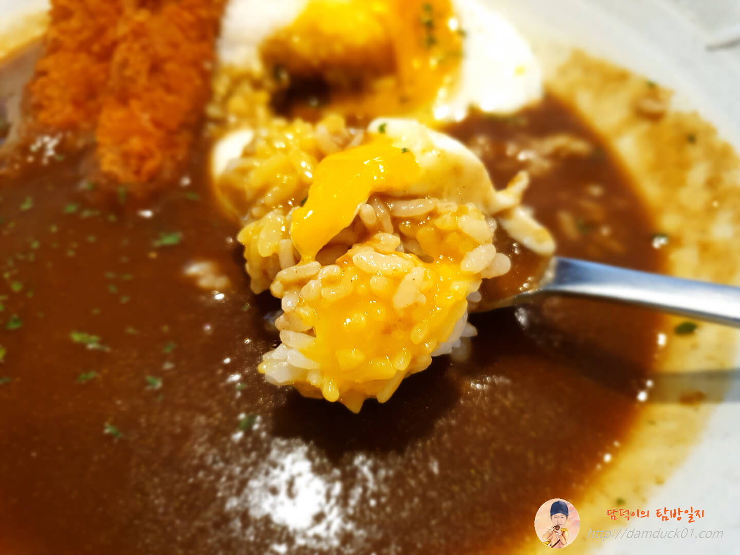 카레와 밥 위에 노른자를 톡 터트려서 함께 떠먹었는데 어라!
