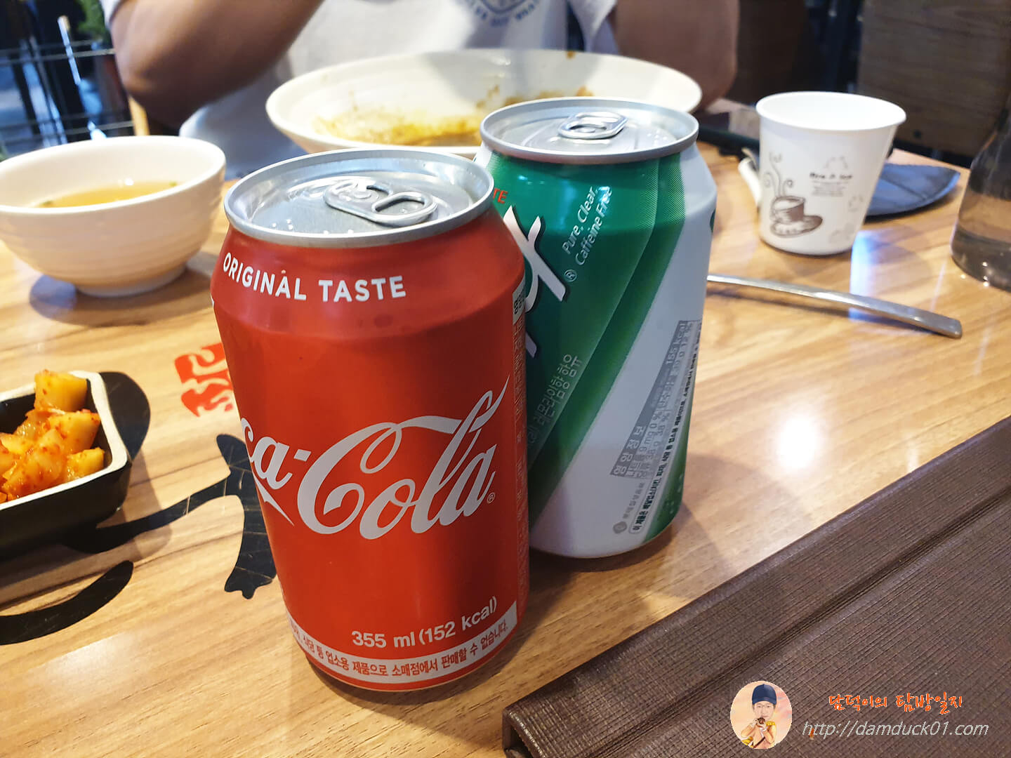 사장님이 콜라랑 사이다를 가져다주셨어요.
