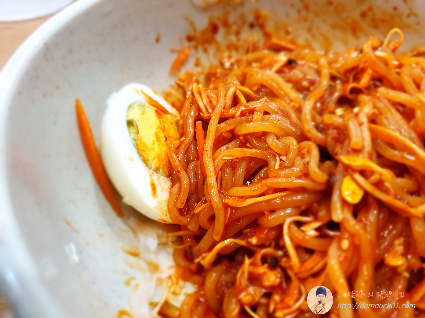 위에 얹어져 있는 달걀, 당근, 오이를 살살 치워내니까 이렇게 콩나물을 적시고 있는 소스가 보입니다.