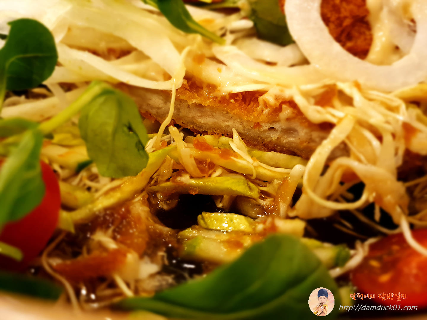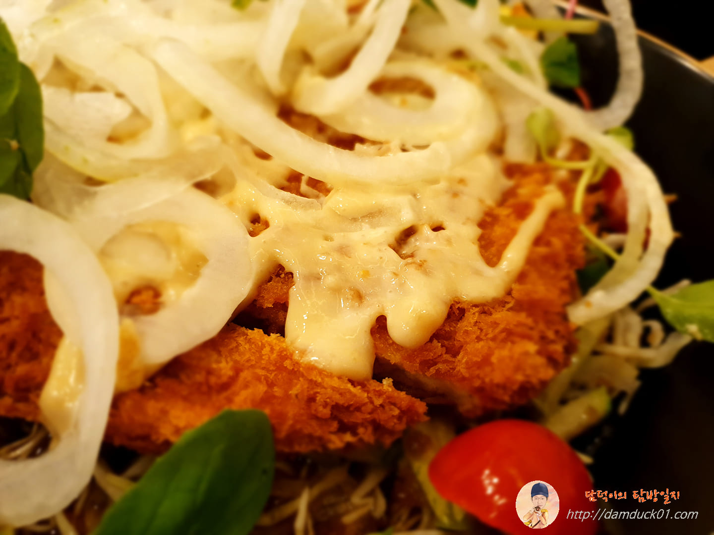 돈가스 위에 가득한 양파들을 치워보니까 돈가스 위에는 마요네즈를 기반으로 한 것 같은 소스가 뿌려져 있는데 아마 이게 설명에 나와 있는 유자 드레싱인 거 같고