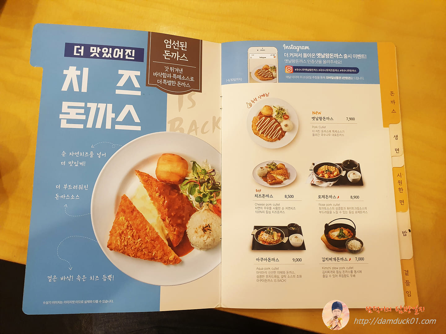 메뉴명만 있고 식당 이름이 없죠? 하지만 담덕이의 탐방일지를 자주 방문하신 분이라면 아실 거예요. 네~ 이번에도 국수나무입니다. 국수나무의 아쿠아 돈가스예요. 좀 시원한 게 먹고 싶었는데