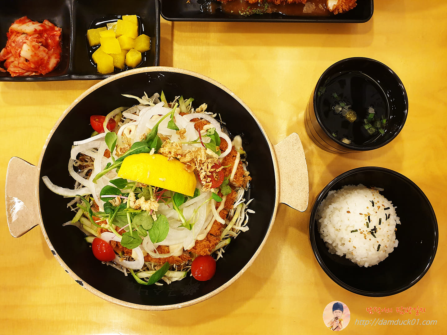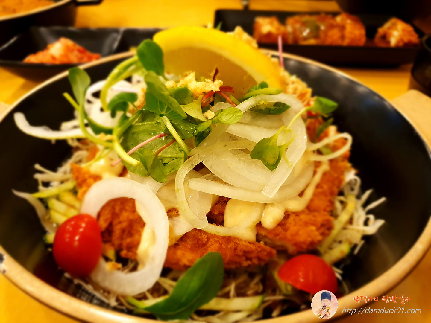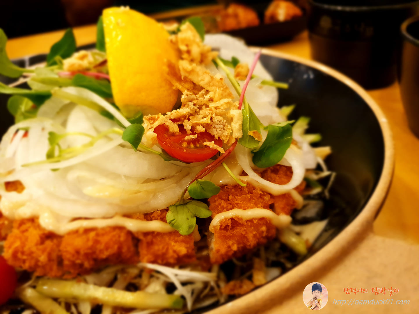 국수나무의 아쿠아 돈가스가 나왔습니다. 일단 비주얼부터가 엄청 많이 바뀌었어요. 돈가스 위아래로 양배추만 있었던 예전과 달리 어제 먹은 아쿠아 돈가스는 돈가스 위에 채 썬 양파가 가득. 그리고 새싹이 얹어져 있고 비주얼적으로 한 방을 날려주는 레몬(?)이 한쪽 올라가 있네요.