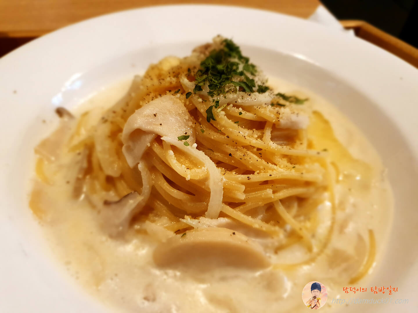 제가 주문한 버섯 크림 파스타가 나왔어요.
