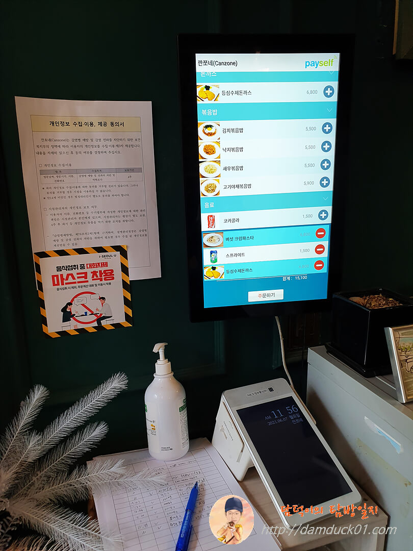 방문일지 작성하고 바로 메뉴 선택하고 결제까지 하고 나서 자리에 앉는 시스템입니다.