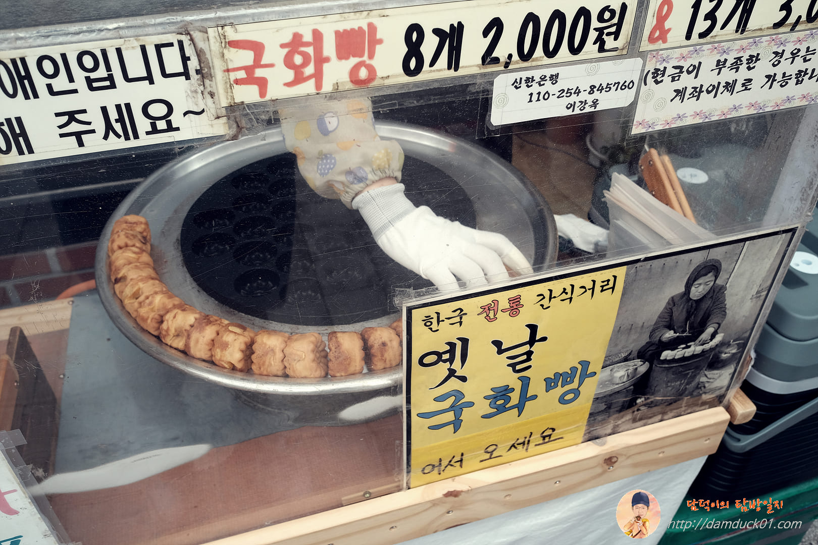 그렇게 돌아다니다가 만나게 된 반가운 먹거리, 국화빵입니다. 한국 전통 간식거리가 맞는지는 모르겠지만 추억의 간식거리가 맞긴 하죠. 요즘 국화빵 만나기 힘들었는데 여기 있네요. 파시는 사장님이 귀가 잘 안들 리시는 거 같으니 눈을 마주치고 나서 주문을 해 주세요.