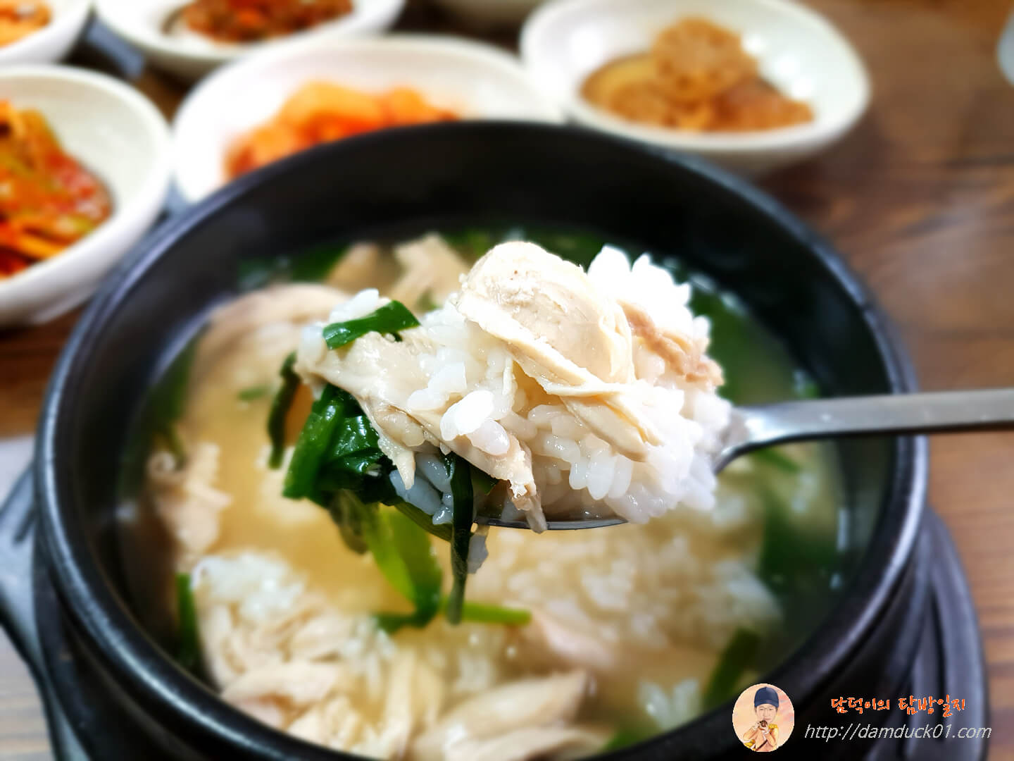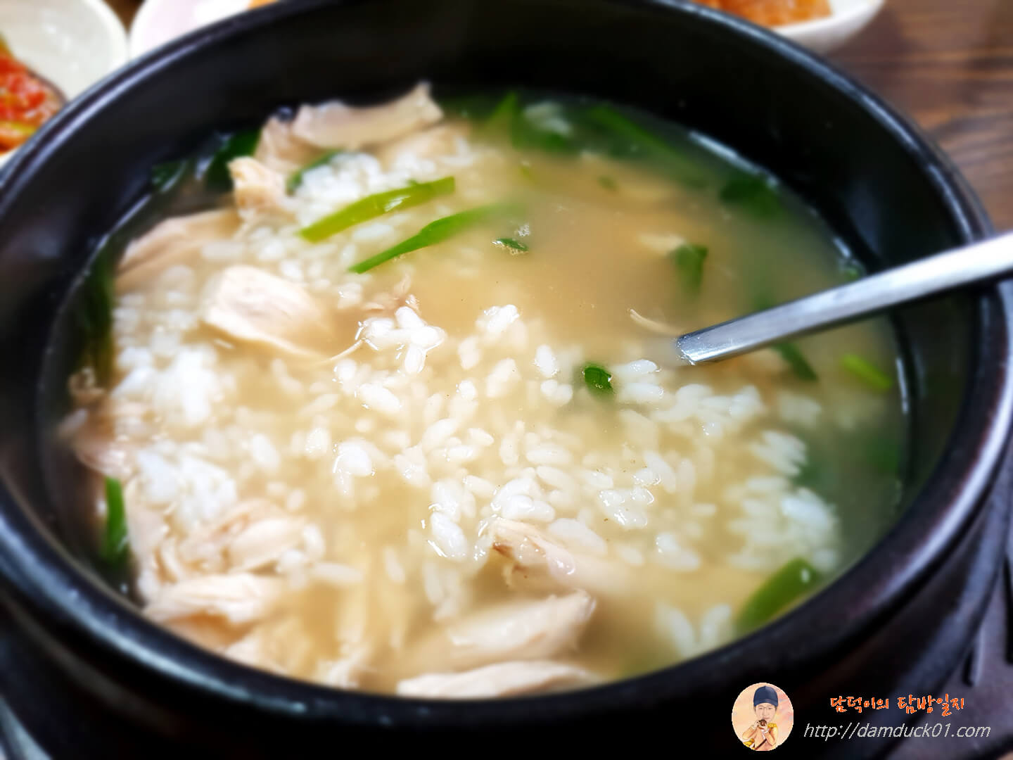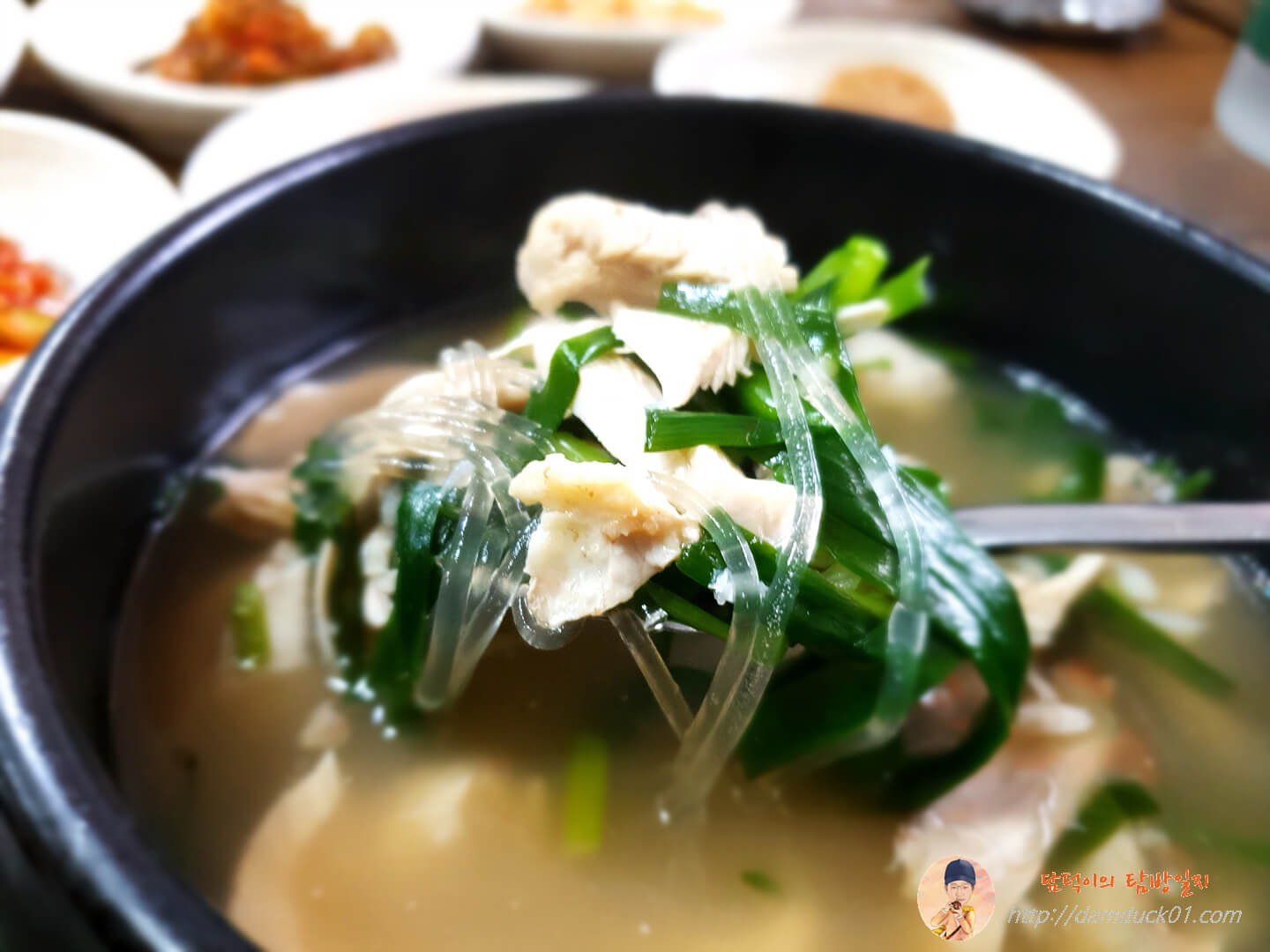 저는 바로 닭곰탕을 주문했고 탐방원은 닭계장과 닭칼국수를 고민하다가 결국 저와 같은 닭곰탕으로 주문을 변경해서 결국 닭곰탕 두 개를 주문했고 오래 걸리지 않아 닭곰탕이 나왔습니다. 맑은 국물에 부추가 꽤 많이 들어 있는 닭곰탕입니다.