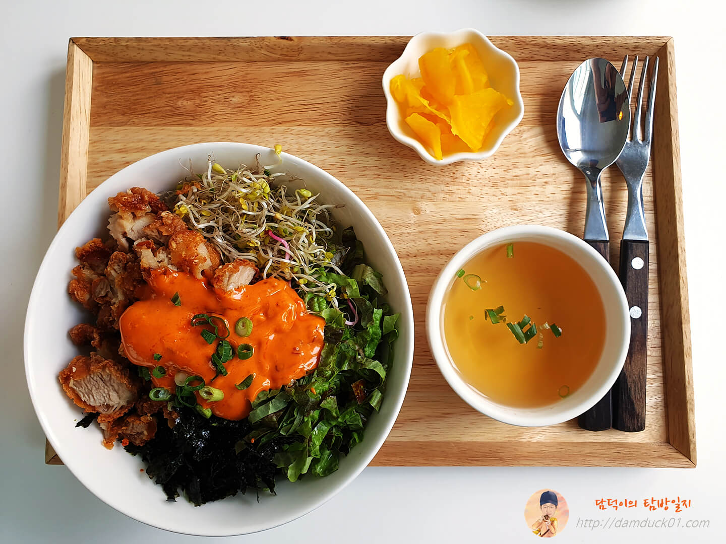 제가 주문한 9,000원짜리 마라치킨마요덮밥입니다. 깔끔한 한 상차림으로 나옵니다.