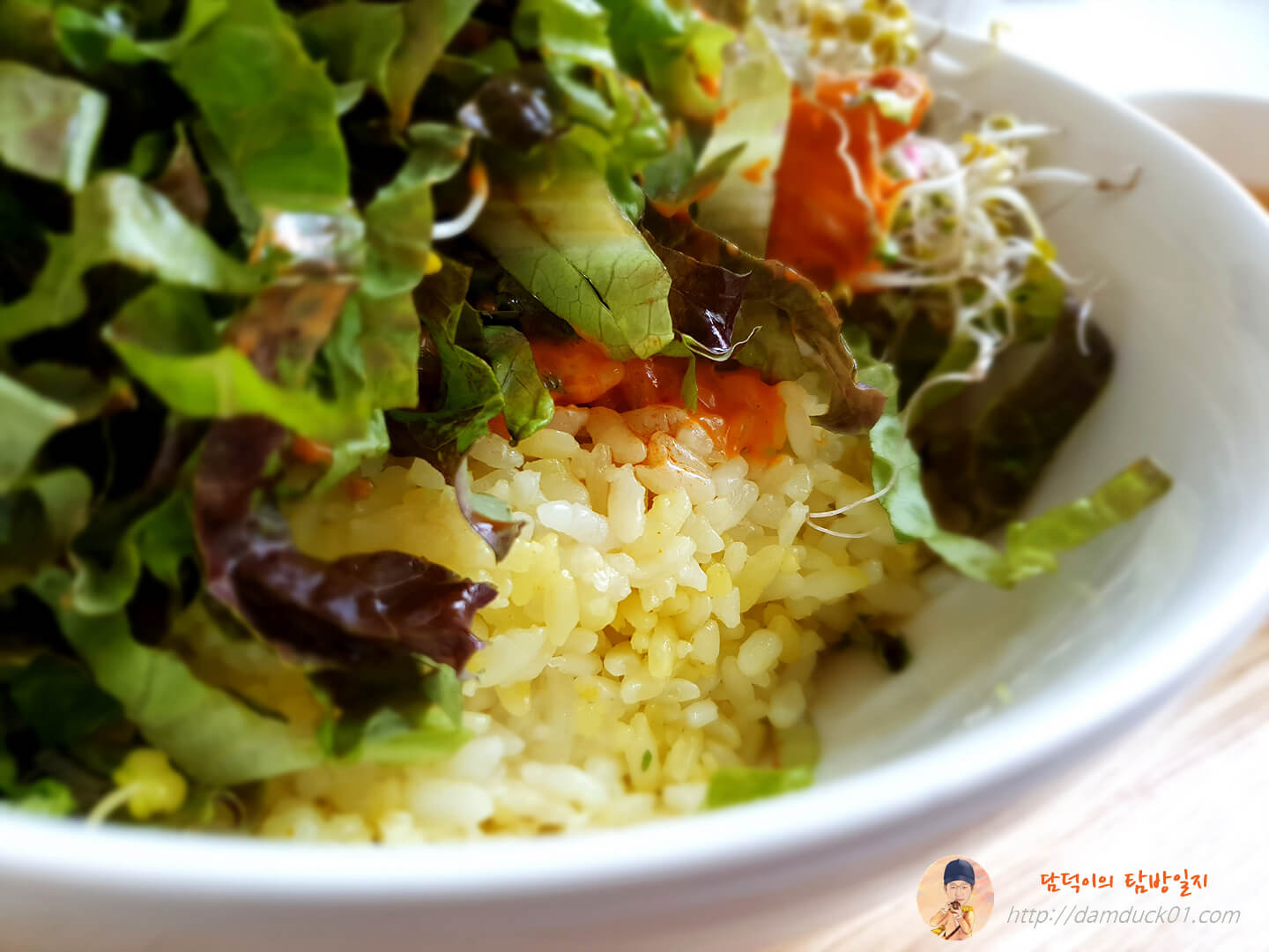 비비기 전에 또 뭐가 있나 살펴봤는데 오호! 밥도 그냥 흰밥이 아니고 강황 밥입니다. 밥이 살짝 노란색이죠.