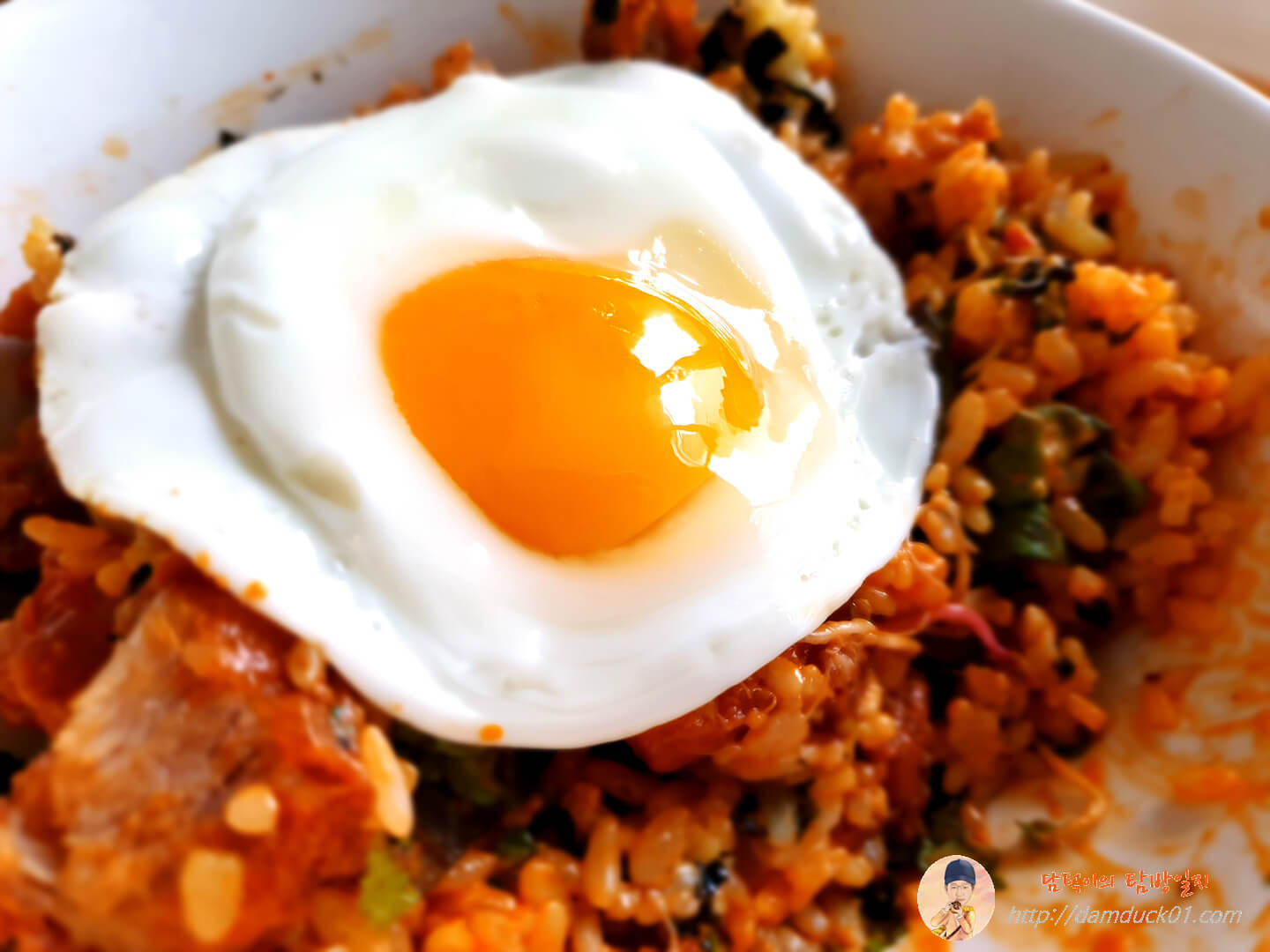 그런데 한 숟갈 먹고 나니까 주문할 때 추가한 반숙 계란이 안 보입니다. 직원 분을 불러서 물어봤더니 착오가 있었다고 합니다. 바로 가져다주셨어요. 이렇게 흰자만 익혀서 만든 프라이가 별도 접시에 나왔습니다. 그대로 밥 위에 얹어서 노른자를 톡! 그리고 맛있게 냠냠