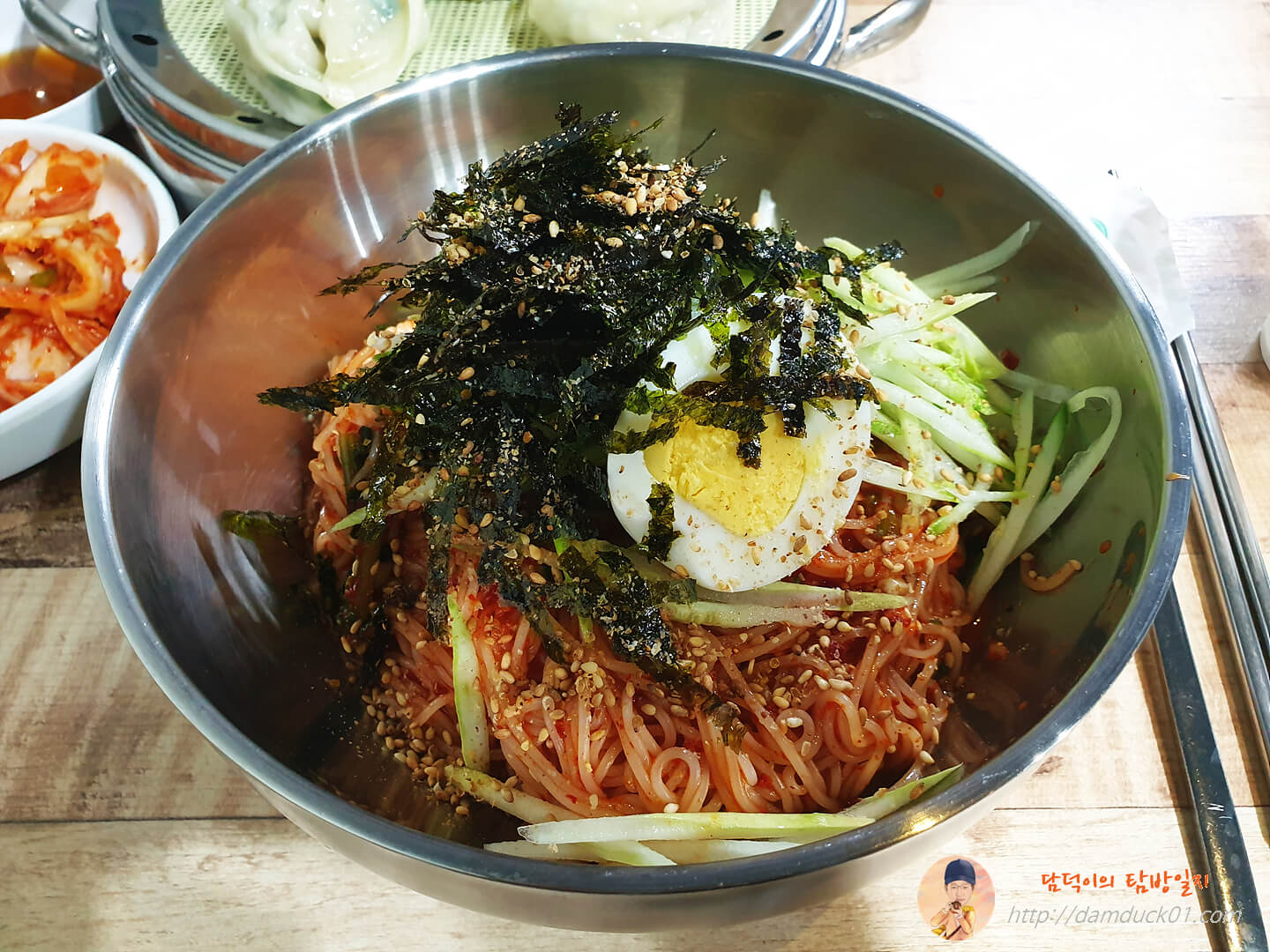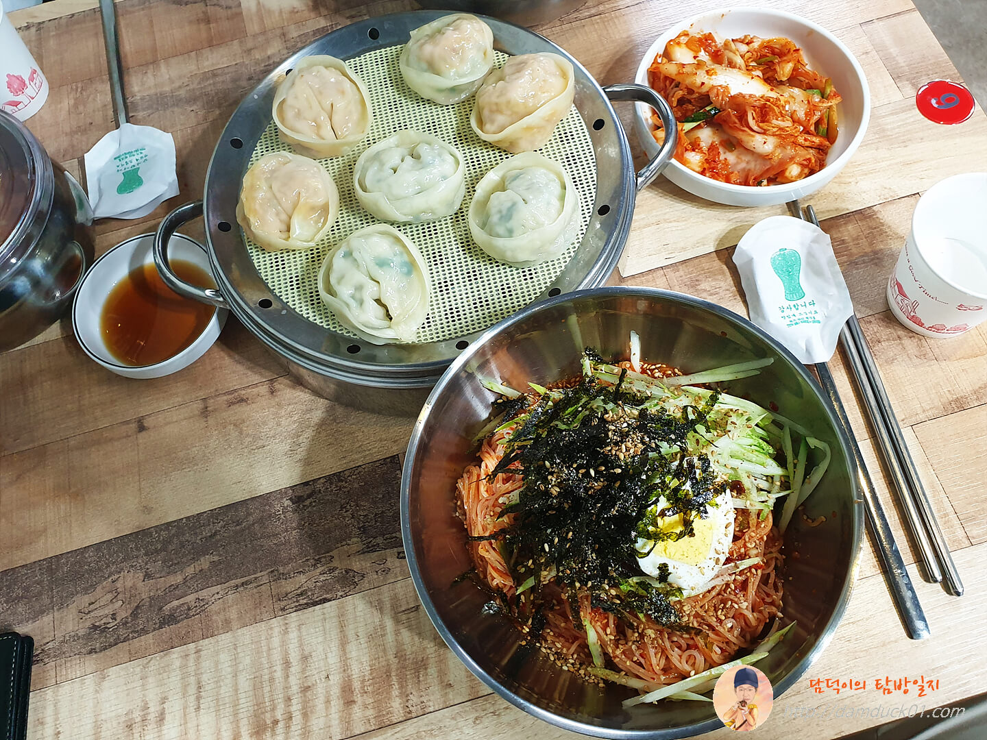 찐만두와 열무 비빔국수가 나왔습니다. 만두는 메뉴판에 김치/고기 7개라고 적혀 있었는데 지정을 안 하고 주문하면 이렇게 섞어서 주시는데 김치 만두 4개, 고기만두 3개 구성으로 만두가 나옵니다. 열무 비빔국수는 와~