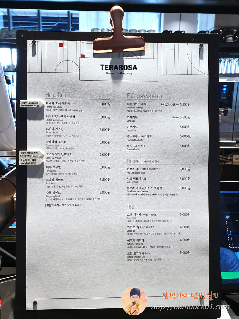 메뉴판을 자세히 보고 주문을 해야 하는데 이때 또 통화 중이라 일행 중 한 명이 강릉 블랜드 주문하는 소리만 듣고 저도 강릉 블랜드 주문을 부탁드리고 전화 때문에 잠시 밖으로...