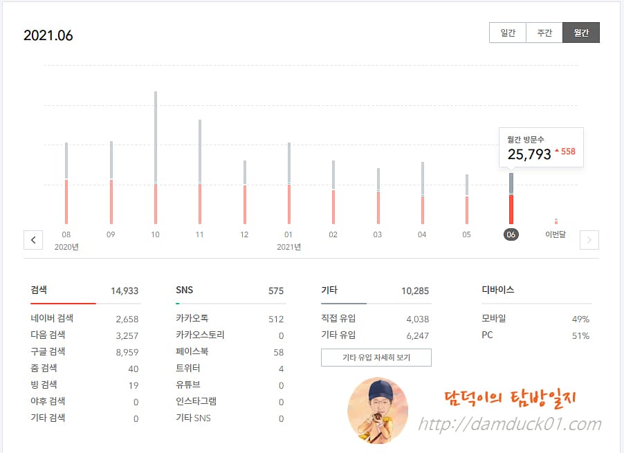 2021년 6월의 결산을 시작합니다. 일단 결론부터 말씀드리면 6월도 망했어요. 5월에 이어 다음 메인 등록 실패, 일 방문 수 1,000 역시 두 달 연속 실패했네요.