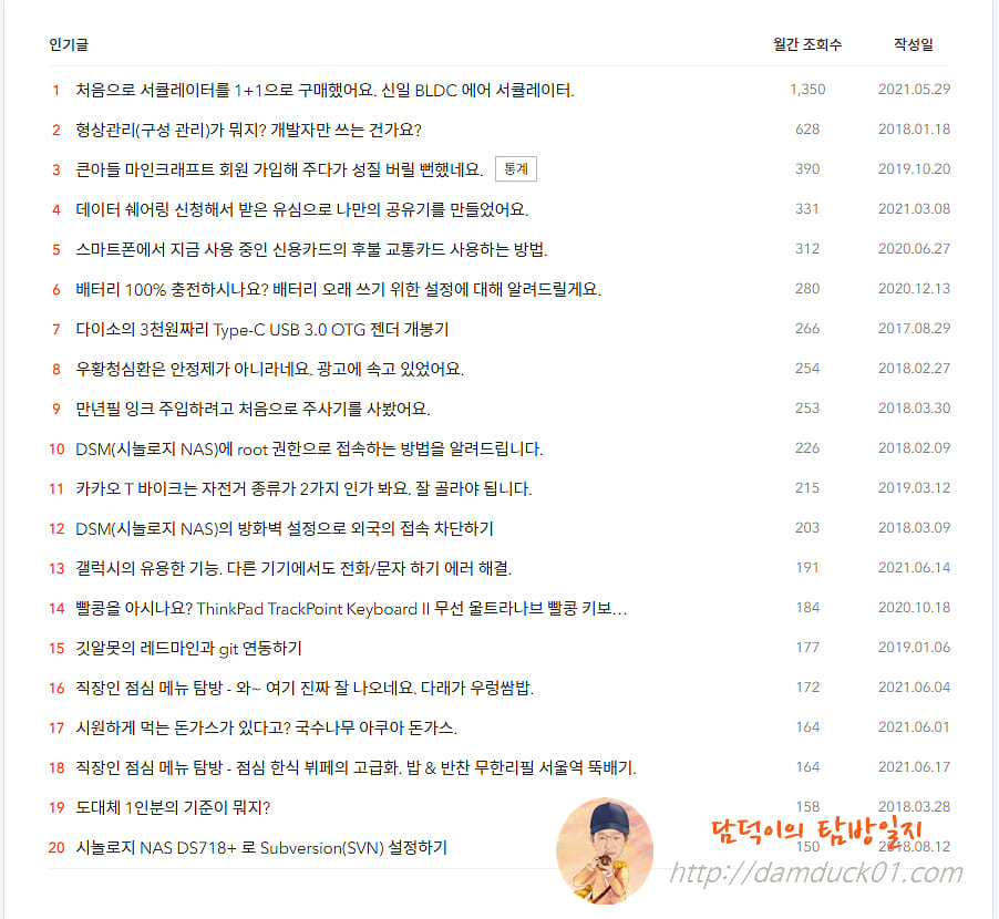 인기 글 TOP 20에 새로 진입한 글들을 살펴보면 월간 조회 수 266을 기록하며 인기 글 순위 7위로 진입한 "다이소의 3천 원짜리 Type-C USB 3.0 OTG 젠더 개봉기" 글이 있네요.