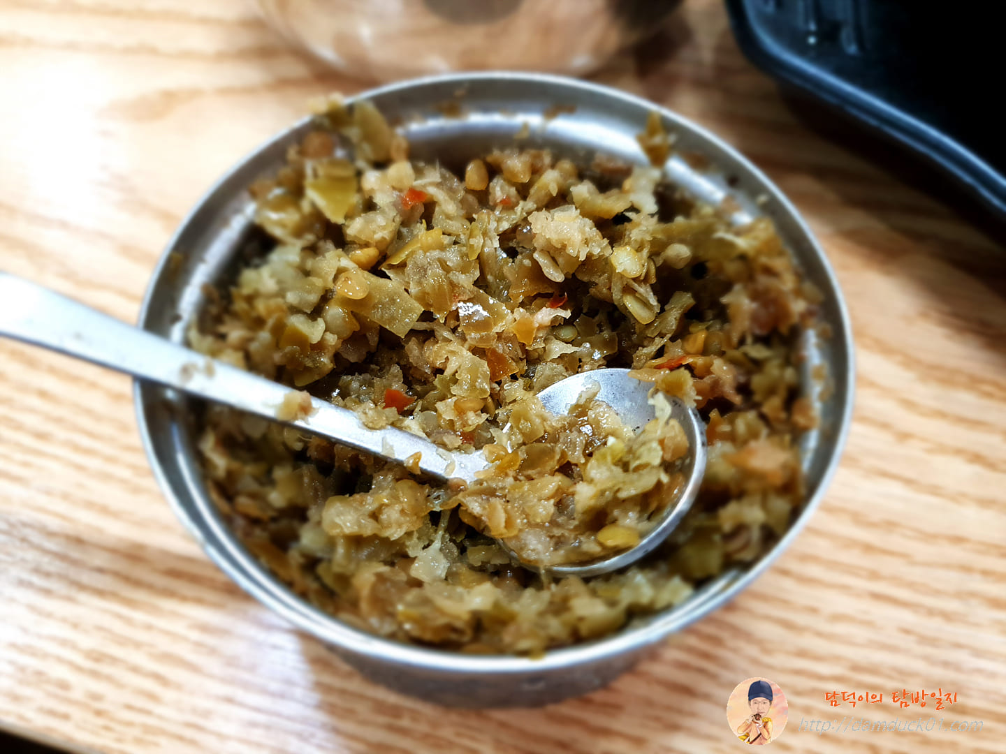 테이블에 요 고추가 있는데요. 이미 얼큰하고 칼칼하고 매콤하지만 저는 이것도 1스푼 반 정도를 더 넣고 국물에 풀어줬어요.
