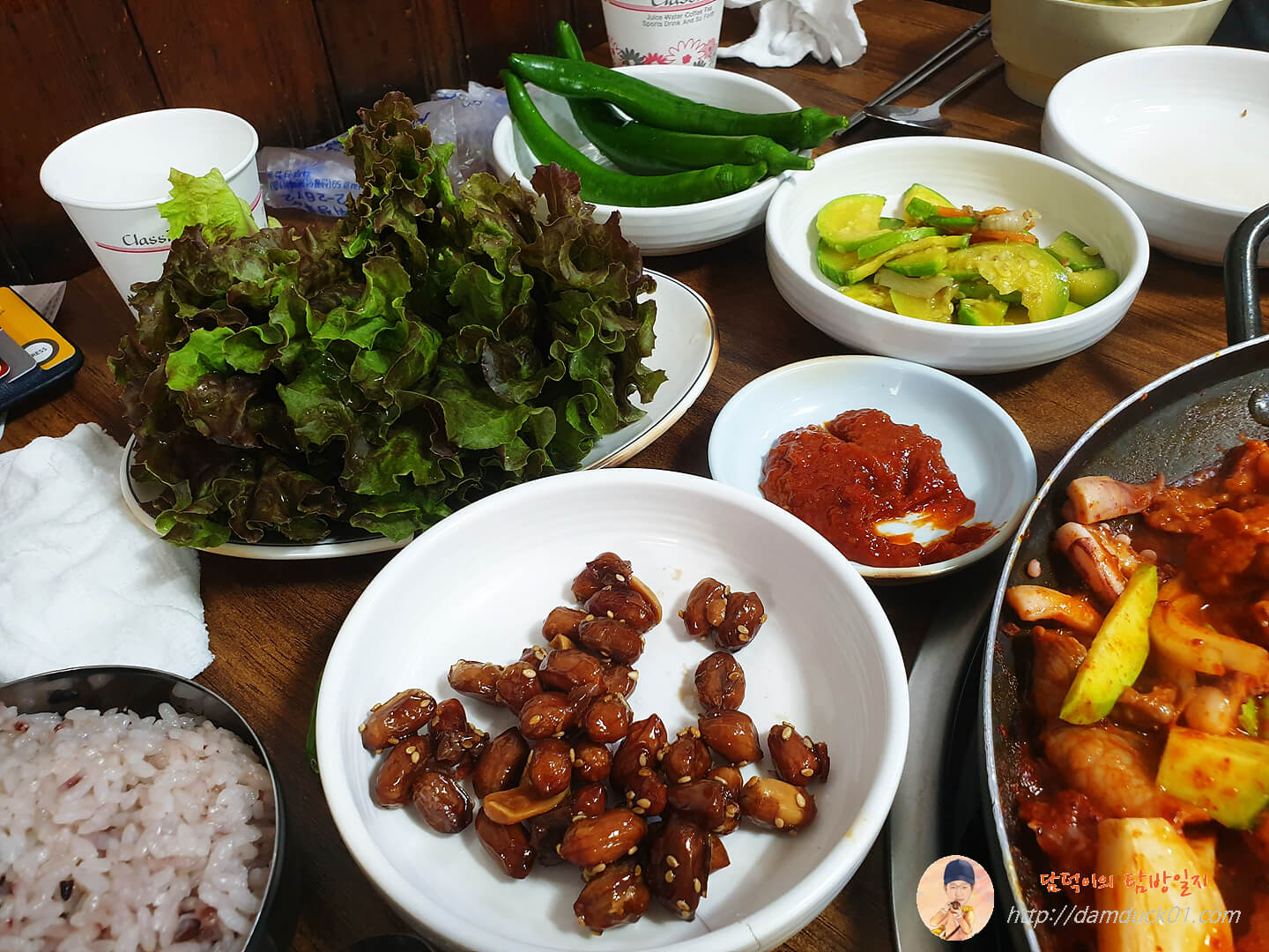 상추랑 고추, 호박 볶음 등 흔히 말하는 시골 밥상 느낌이 가득합니다.