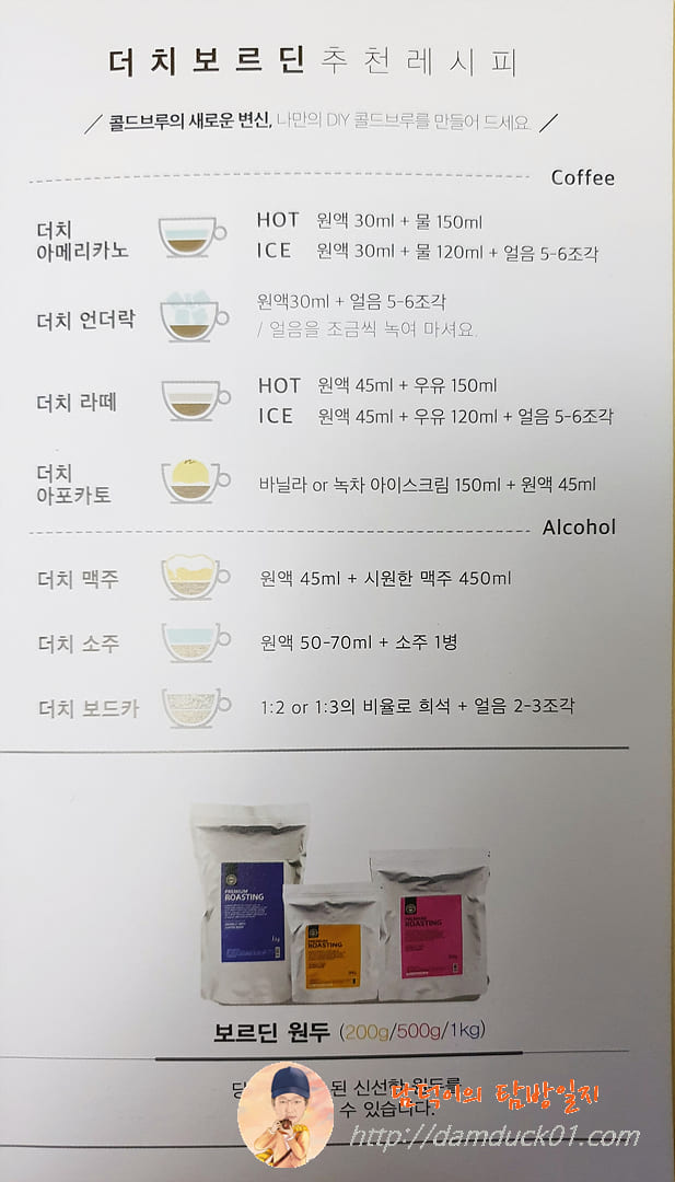 안에 들어 있는 설명서에는 원두 이름과 각 맛의 특징들을 설명해 놓았고요 콜드브루로 만들 수 있는 추천 레시피도 담겨 있네요.