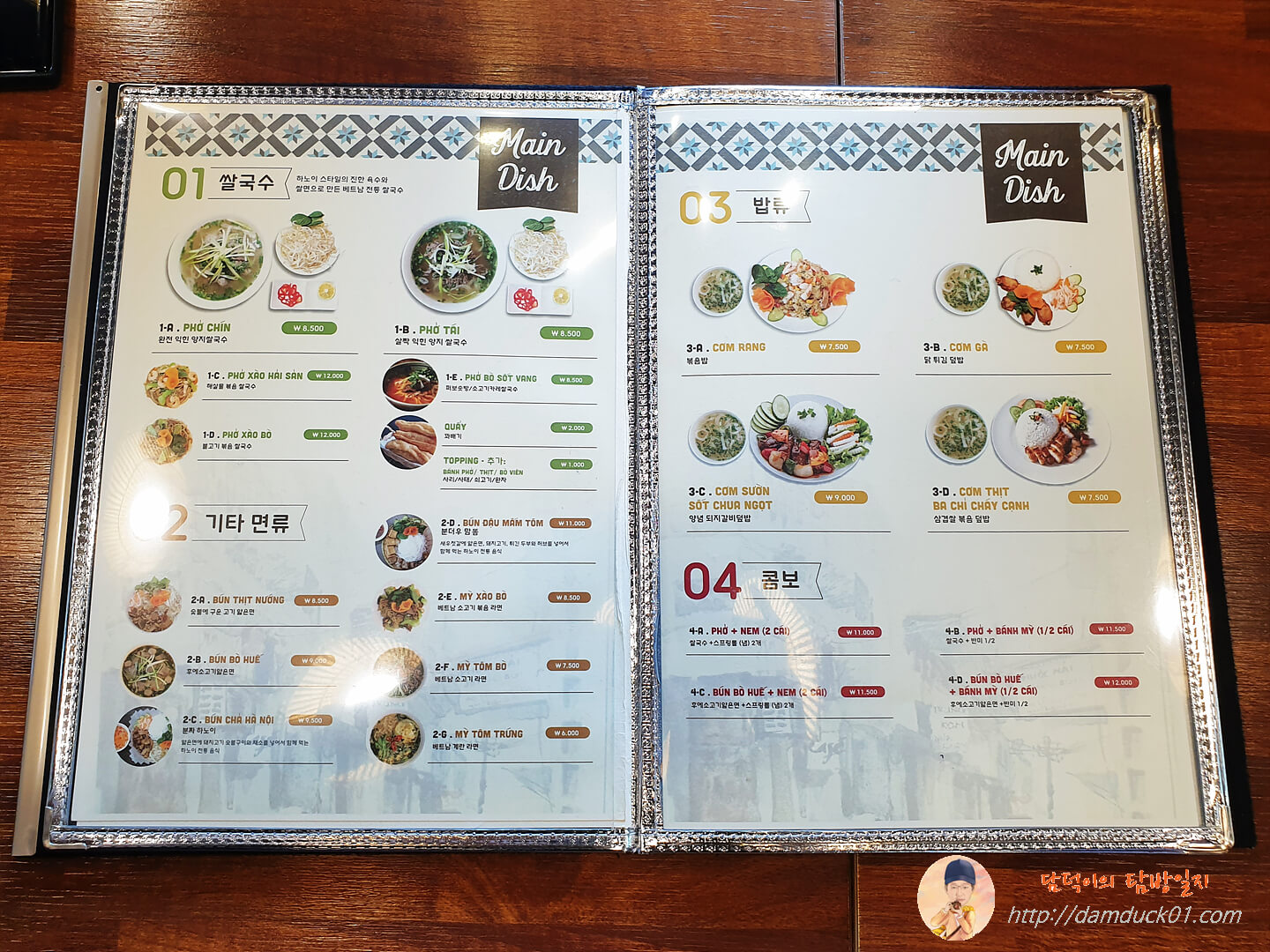 메뉴판을 살펴보면요. 쌀국수랑 기타 면류, 밥류랑 콤보라는 이름의 세트 구성을 판매하고 있어요.