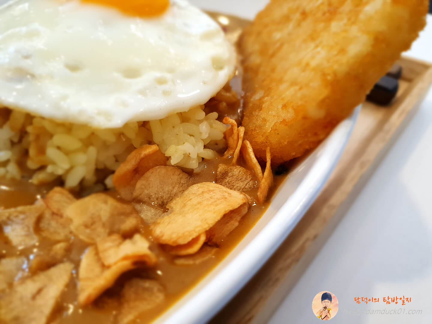 카레를 밥이랑 슥슥 비벼가면서 먹었는데 이렇게 카레에 비벼진 밥에 마늘 후레이크, 해시브라운과 함께 먹으니 다양한 식감으로 더 맛있게 즐길 수 있었어요.