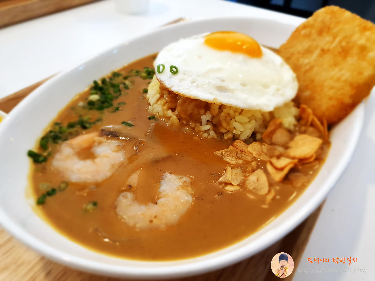 새우와 마늘 후레이크 그리고 반숙 달걀 프라이가 얹어져 있고 추가한 해시브라운까지 있어서 알찬 구성이라는 생각입니다.