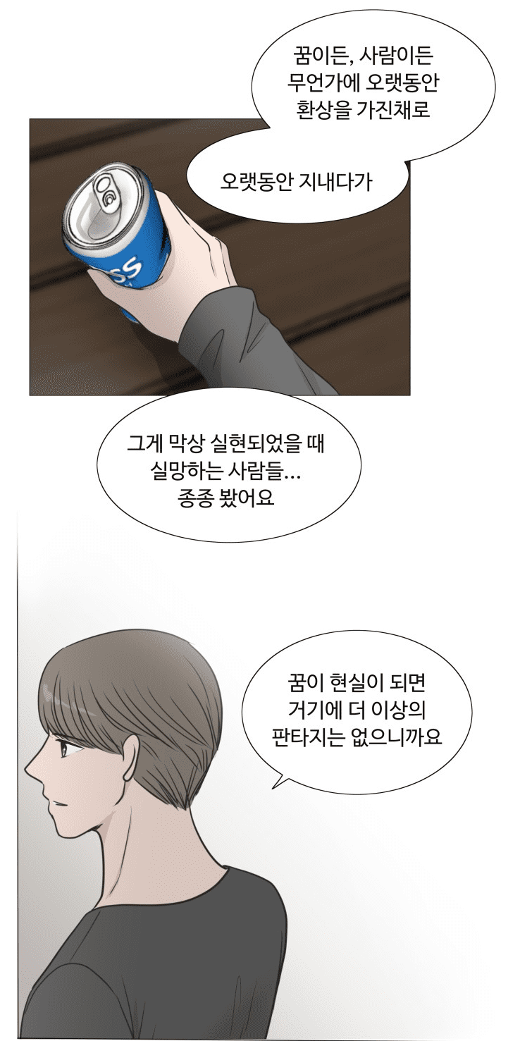 이런 웹툰이 있는 지 몰랐는데요. 이번 주에 처음 본 웰컴 온보드라는 네이버 웹툰이 있습니다. 1화만 읽어 보려고 했다가 14화까지 완독을 한 웹툰인데요. 5화에 위와 같은 대사가 나와요. "꿈이 현실이 되면 거기에 더 이상의 판타지는 없으니까요." 딱 정해진 직업이 아닌 내가 어떤 생각과 가치관을 가지고 또 내가 어떤 걸 할 때 즐거운지를 생각하면서 꿈을 가지는 게 참 중요하다는 걸 이제야 알게 된 거 같아서 씁쓸합니다.