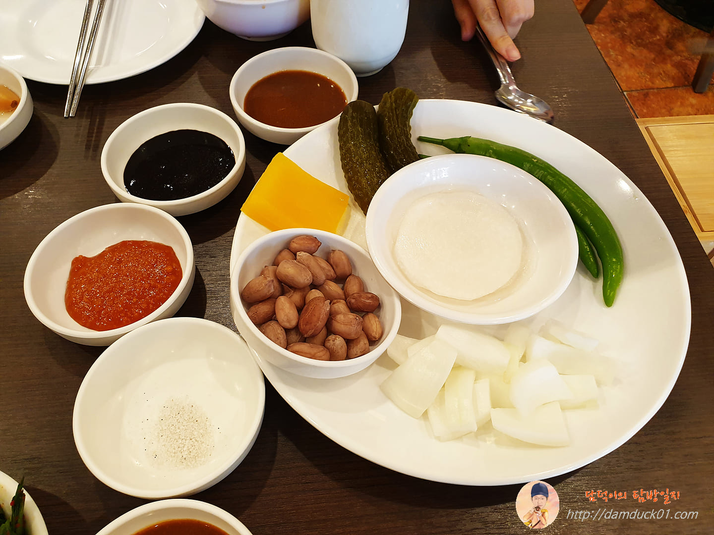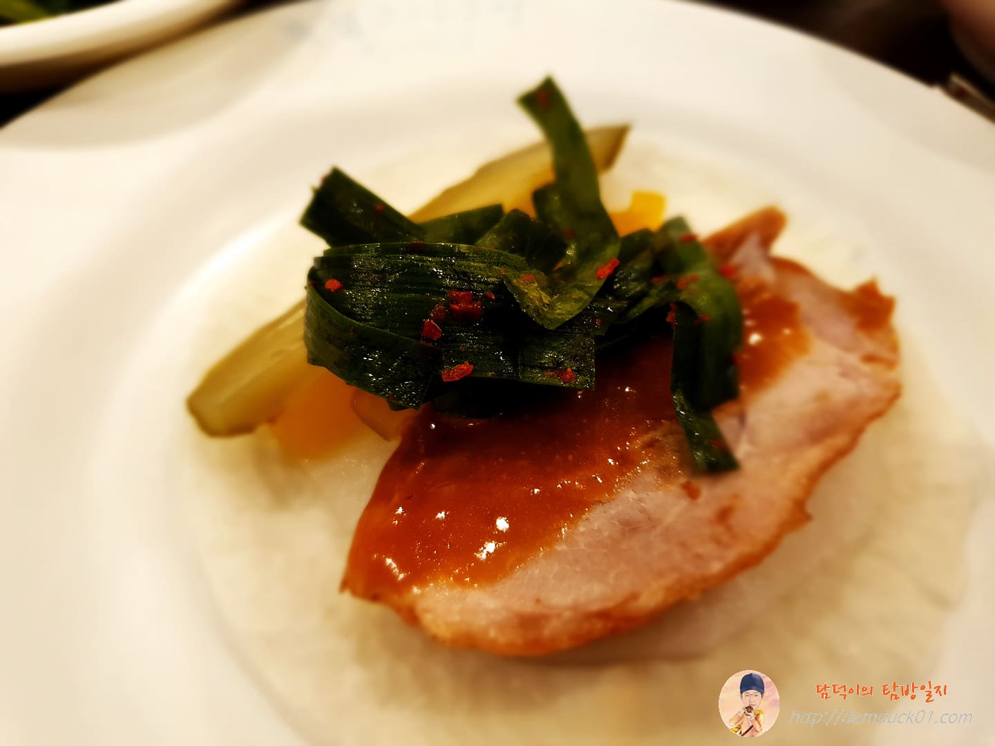 그 위에 오리구이 하나 얹고 땅콩, 오이피클도 얹고 부추김치도 얹어줍니다.