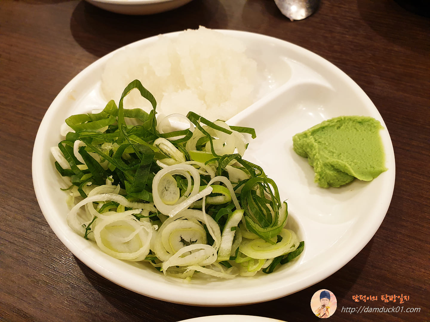 국물에 간무를 푸짐하게 넣고 고추냉이도 조금 많다 싶게 넣어줍니다.