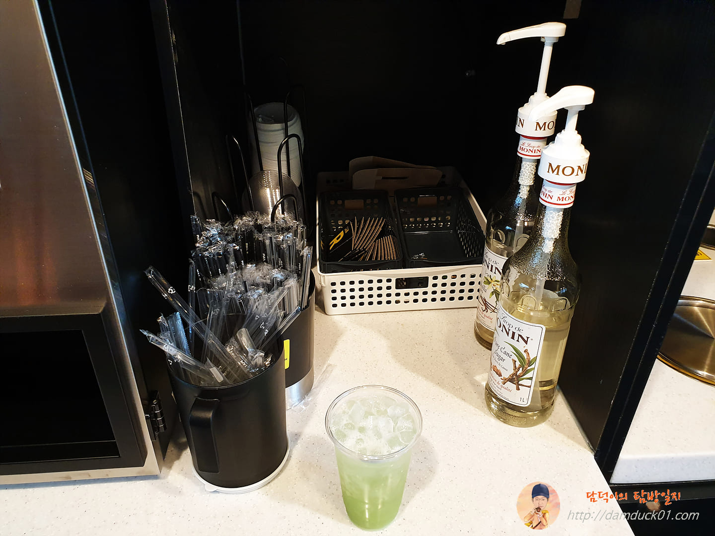 2번 기계 옆에 빨대와 시럽 그리고 컵 홀더가 마련되어 있으니까 이것도 사용자가 직접 세팅하면 준비 끝, 컵 뚜껑도 여기에 있었어요. 이렇게 음료 받는 법을 글로 적어서 어렵게 느껴질 수도 있을 거 같은데 막상 해 보면 어렵지는 않더라고요. 그리고 단계별로 행위가 끝나지 않으면 계속 안내 멘트가 나오기 때문에 누구나 할 수 있을 거라고 생각합니다. 저도 했으니까요.