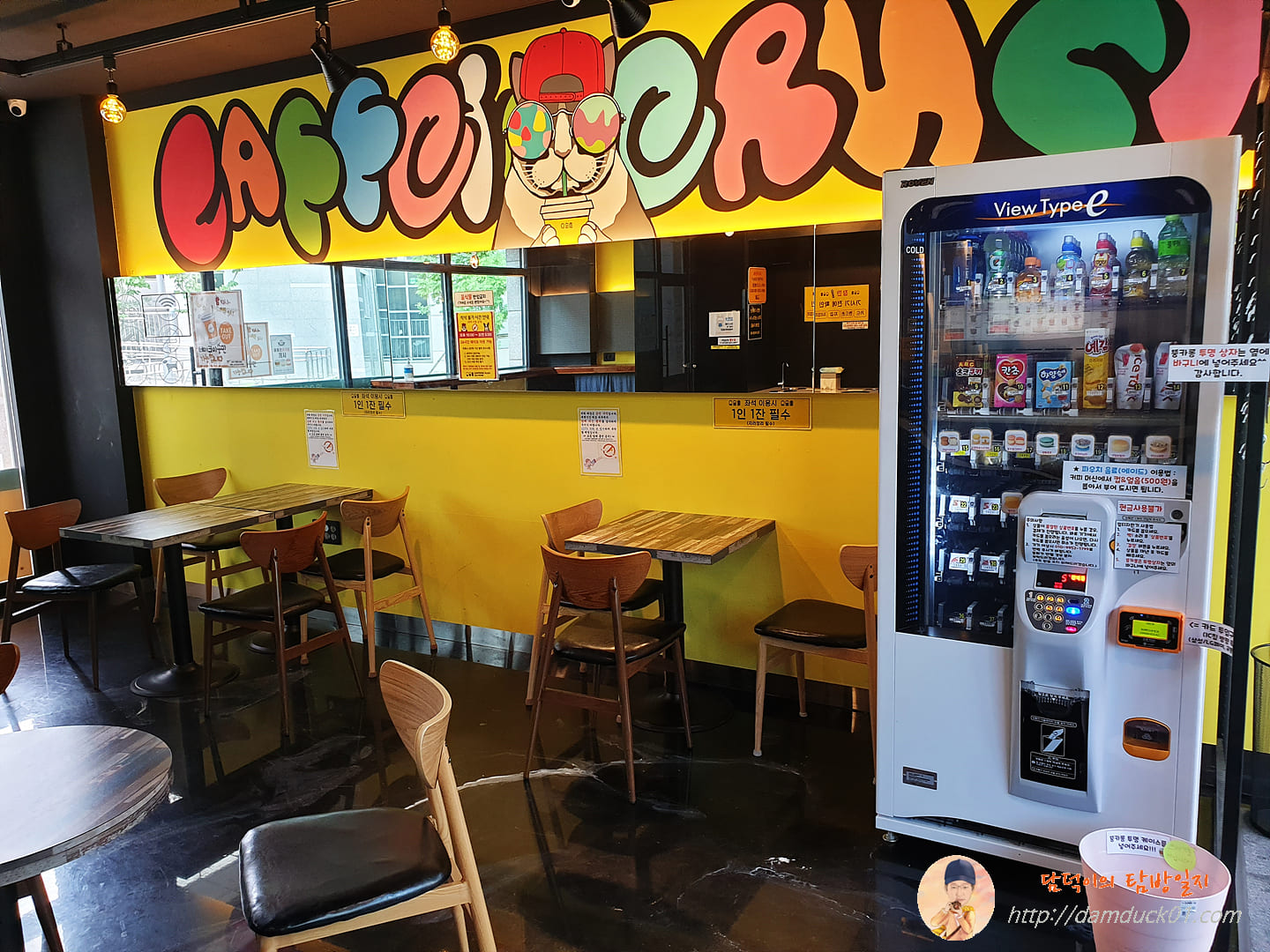 내부는 생각보다 평범합니다. 일단 카페 분위기보다는 즉석 떡볶이 집 같은 느낌도 나는 거 같고 특이한 건 음료와 과자를 파는 자판기가 있다는 점이에요. 보통의 카페 분위기 하고는 다르네요.