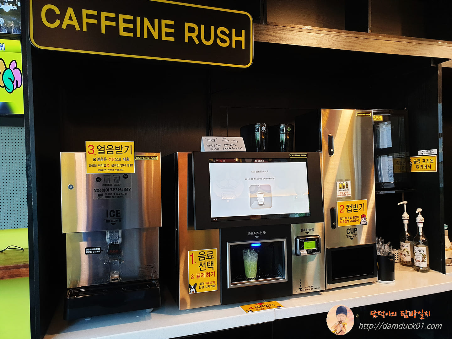 구매할 수 있는 음료는 이 정도가 준비되어 있어요. 많다고 할 수 있는 건 아니지만 커피 종류는 그래도 꽤 있는 거 같죠. 얼음만 500원에 구매할 수도 있고요. 저는 처음 방문한 카페인러쉬에서는 커피가 아닌 상큼 청포도 에이드를 하나 사서 마셔봤는데요. 평소라면 당연히 아이스 아메리카노를 마셨겠지만 이상하게 여기에서 커피를 마시고 싶다는 생각이 없었어요. 그래서 청포도 에이드를 마셨는데 음~ 이전에 무슨 맛 음료라고 해서 타 먹는 가루 있었잖아요. 요즘도 파는지 모르겠지만 딱 그 맛이더라고요. 예상했던 그 맛이었어요.