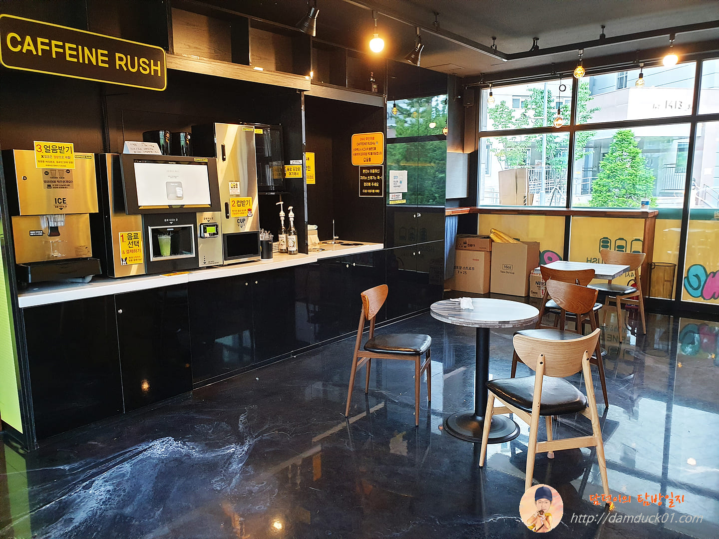 문을 열고 들어가면 오른쪽에는 자판기가 왼쪽에는 커피 및 제조 음료를 하기 위한 기계가 있어요. 실내가 제가 생각한 것보다 많이 큽니다. 테이블이 조금 작은 거 같긴 한데 테이블 개수는 많아요.