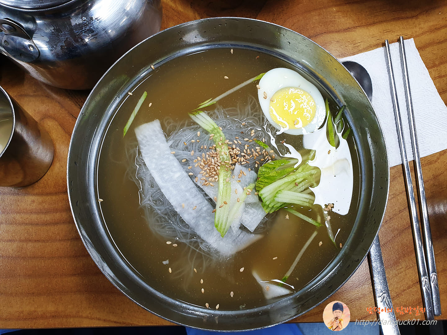 반찬은 두 가지. 배추김치와 냉면 무, 냉면집에서는 반찬을 따로 안 주는 곳이 많은데 여기는 냉면 전문점이지만 다른 한식 메뉴들도 있어서 다른 반찬들도 꽤 많아요. 냉면이 아닌 다른 메뉴를 주문하면 더 많은 반찬이 나오는데 어제는 탐방원들이 전부 냉면을 주문해서 그런 건지 반찬이 두 가지만 나왔네요.