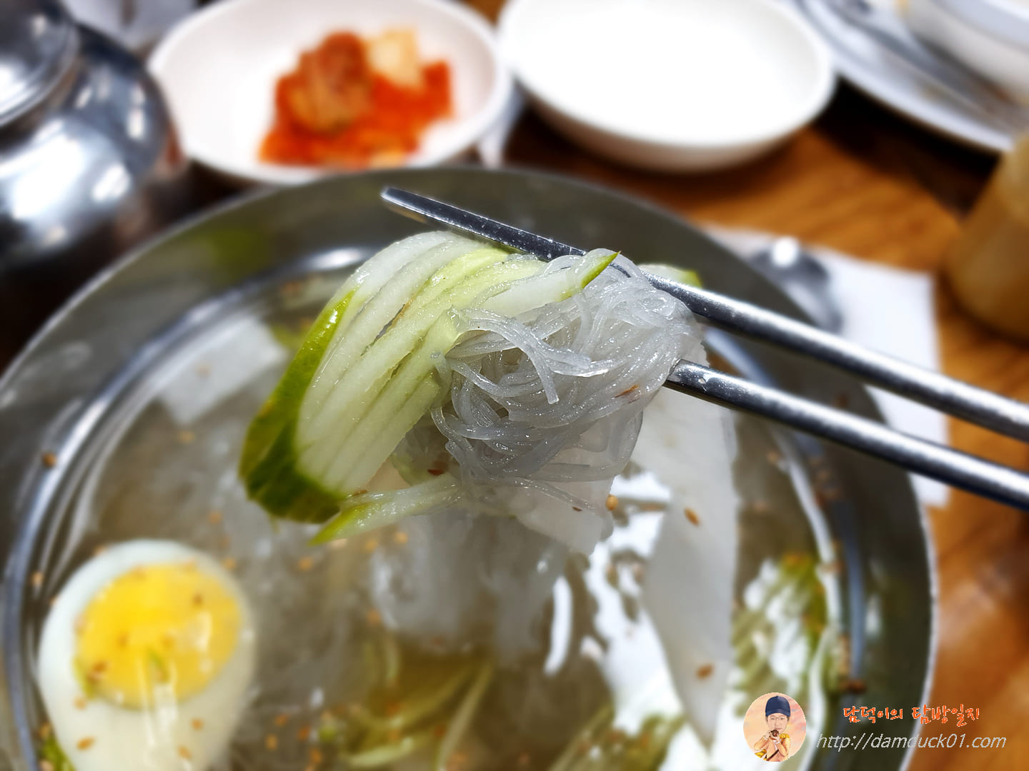 시원한 국물에 냉면 한 젓가락을 오이와 무를 함께 들어서 먹으니 씹는 식감도 좋고 이 시원함을 글로 전달을 못하겠네요. 이럴 때 제가 글을 잘 쓰면 참 좋겠다는 생각을 합니다. 이렇게 한 젓가락 먹고 국물 후루룩~ 하고 나면 캬~ 이 시원함은 잠시나마 이 뜨거운 더위를 잊게 해 준답니다. 그런데 웃긴 게 전 이 시원함과 함께 또 뜨거운 육수를 같이 마셨다니까요. 우리 탐방원들 중 저만 육수를 마시더라고요. 시원함과 따뜻함을 동시에 즐기는 저. 비정상인가요?