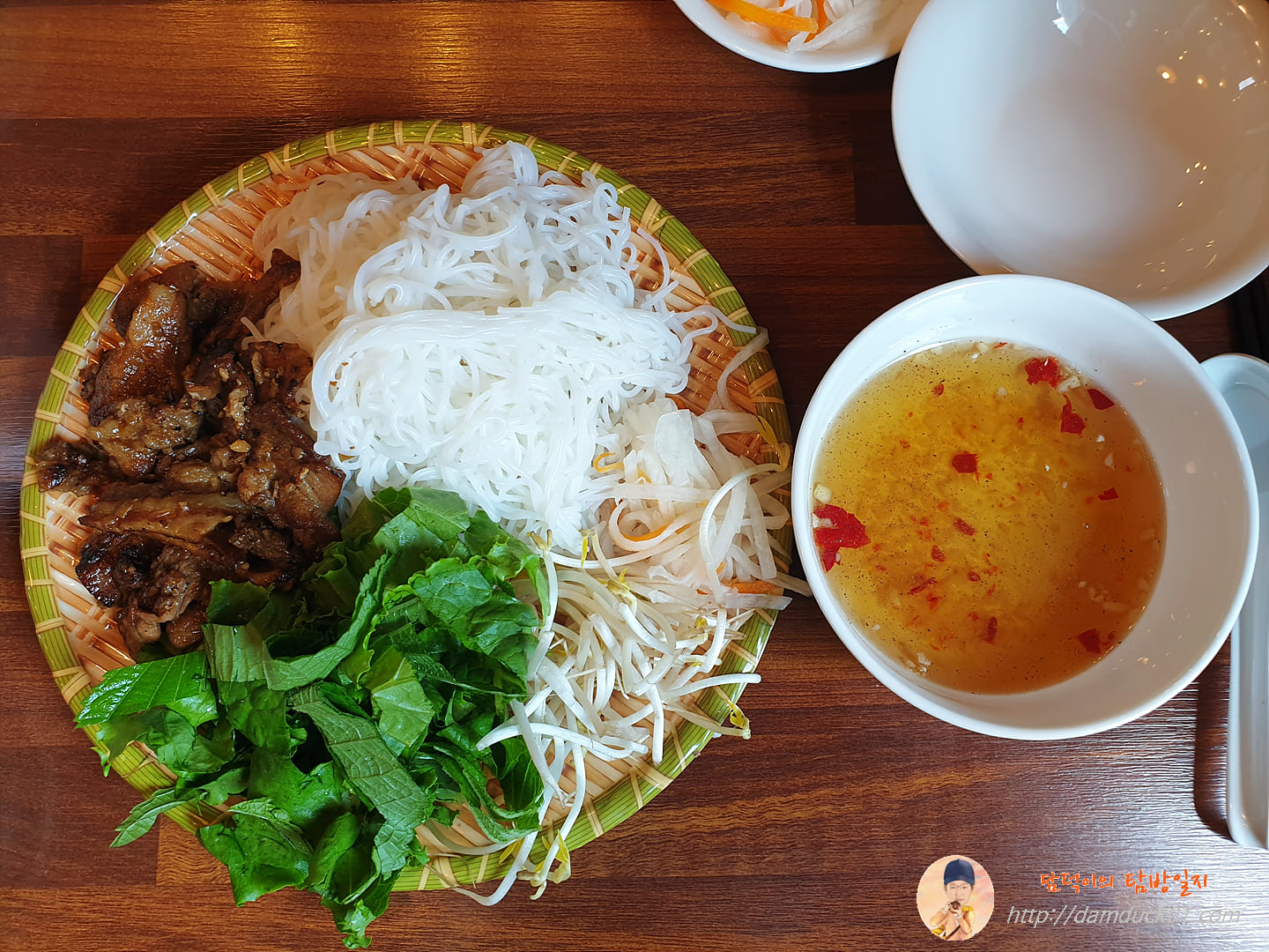 그리고 떡진 쌀국수를 잘 풀어서 채소와 함께 한 입, 맛있게 구워진 돼지고기 숯불구이와 함께 한 입, 먹어보면 맛있습니다. 전체적으로 달달하고 채소와 고기의 씹히는 맛도 좋고 만족스럽네요. 아~ 가격을 안 적었는데 가격은 9,500원인데 이 가격에 이렇게 푸짐한 양의 분짜라면 이건 역시 추천 메뉴죠.