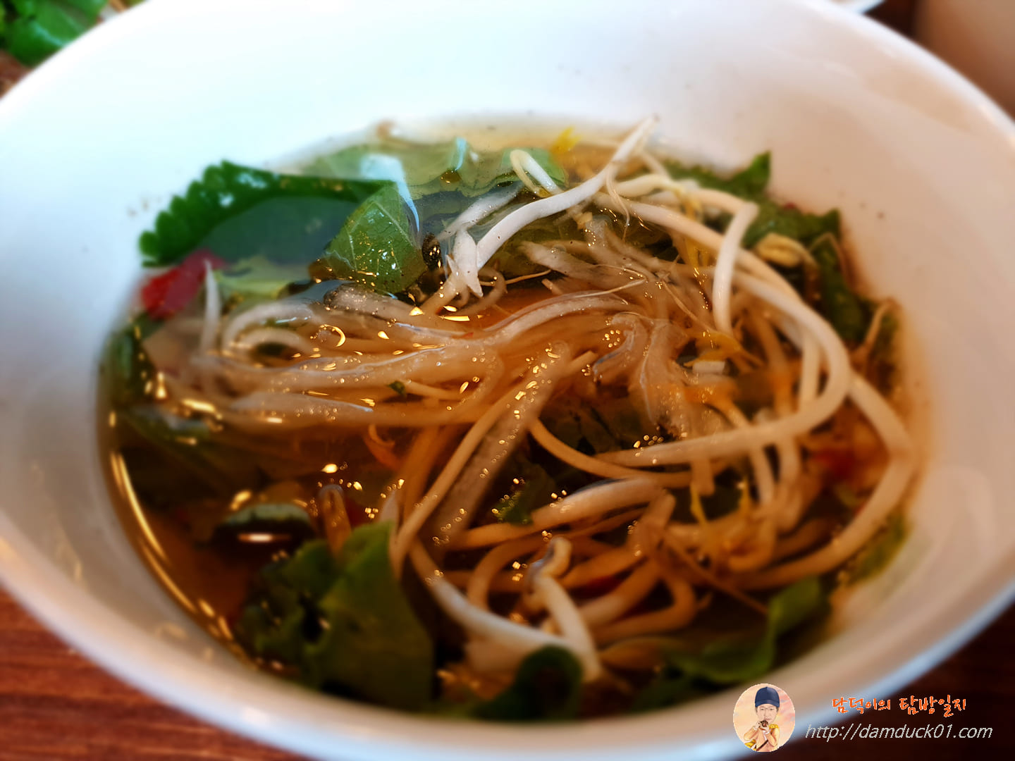 소스에다가 상추, 깻잎, 숙주나물과 양파를 담가서 살살살 풀어줍니다. 이러니까 진짜 샤부샤부 같네요. 아~ 그리고 이 소스 달달하니 맛은 좋았는데 따듯하더라고요. 이 소스에 얼음 넣고 차갑게 하면 맛이 어떨까? 궁금해졌습니다. 아무래도 요즘 날씨가 더우니까요. 냉분짜 같은 느낌으로 먹어도 괜찮을 거 같던데... 오~ 이렇게 메뉴 만들면 대박 날 거 같다는 생각이 드는데요.