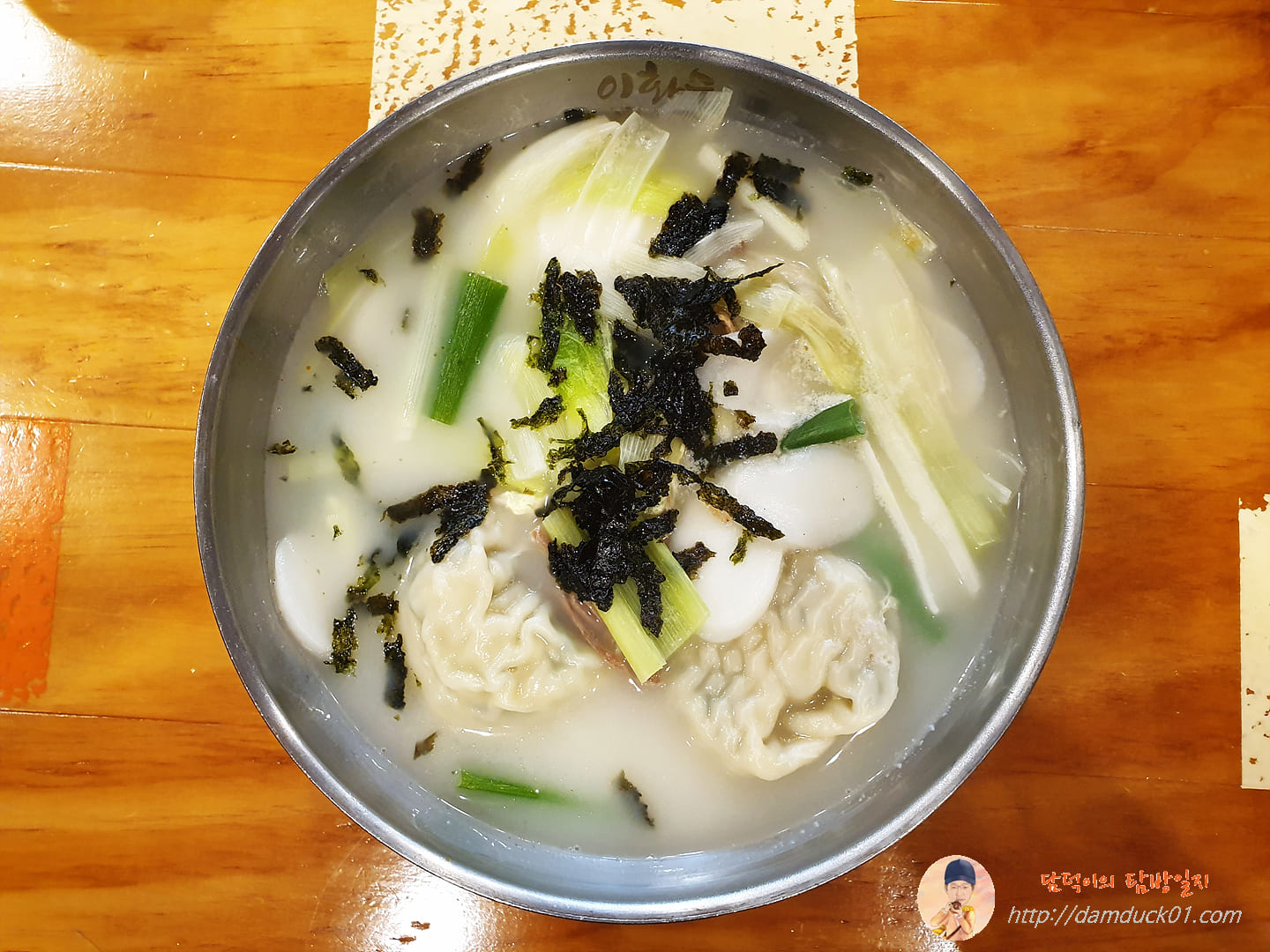 진한 사골 국물에 커다란 만두가 3개랑 떡들이 들어있고요.