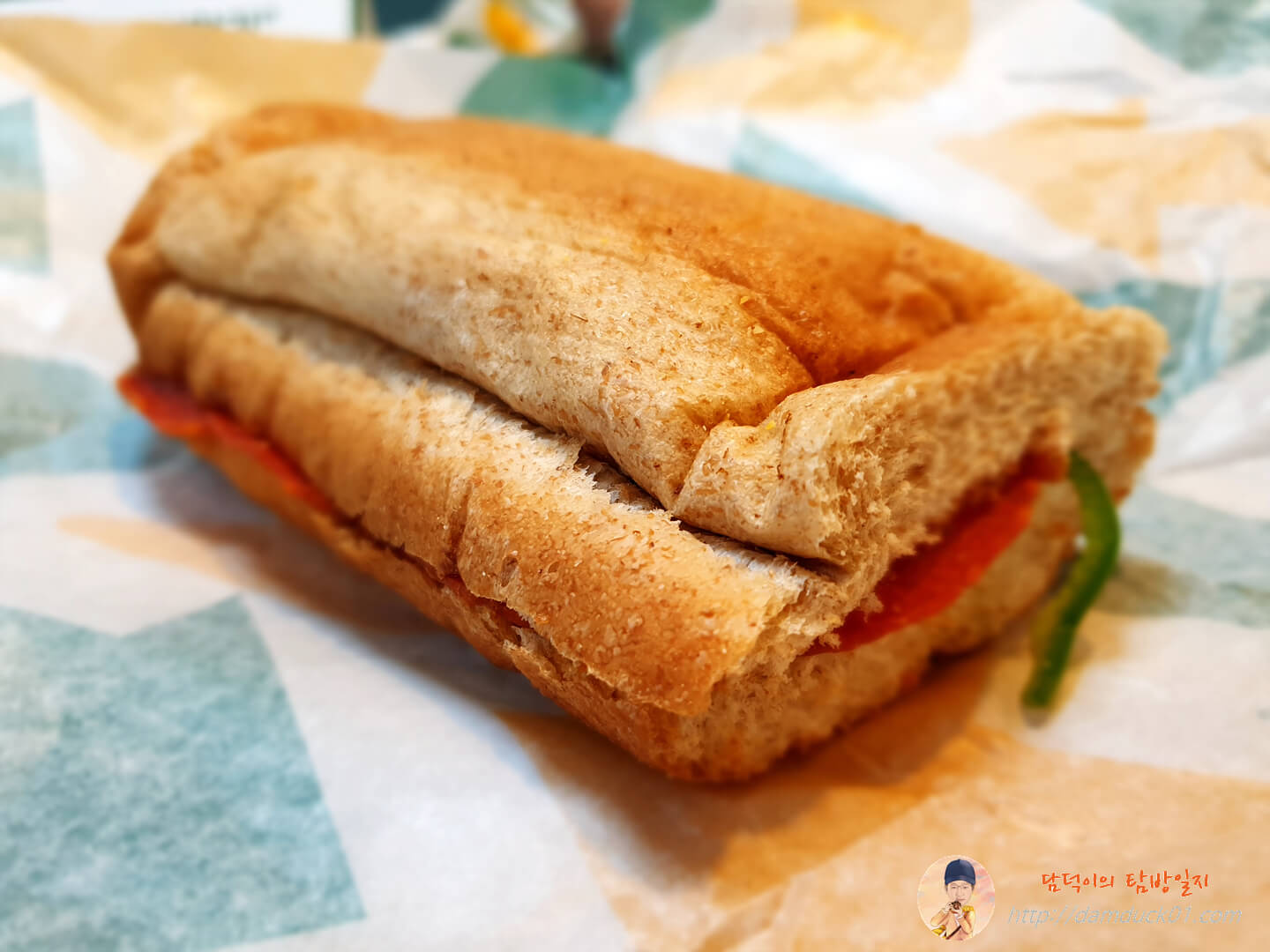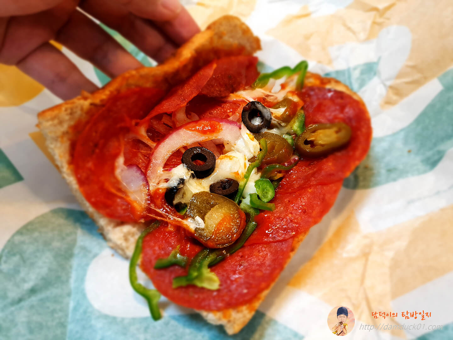 전에 먹었던 샌드위치들은 채소랑 다른 재료들이 많이 들어가서 빵이 저렇게 닫혀 있지 못했는데 페퍼로니 피자 썹은 완벽하게 닫혀 있습니다.