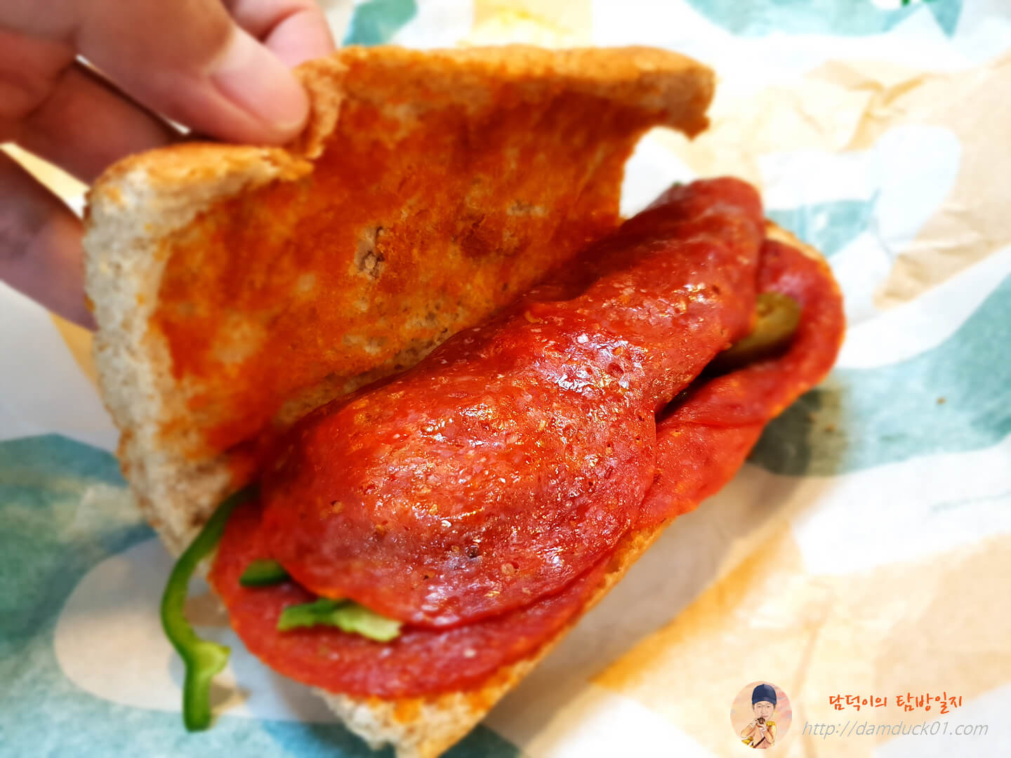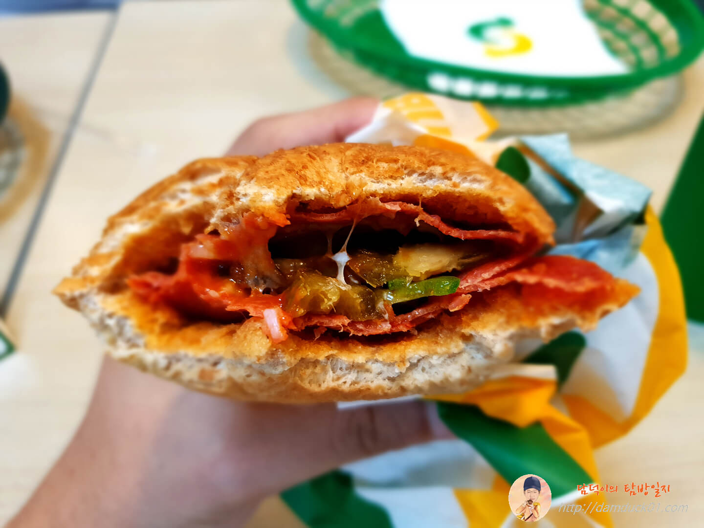 전에 먹었던 샌드위치들은 채소랑 다른 재료들이 많이 들어가서 빵이 저렇게 닫혀 있지 못했는데 페퍼로니 피자 썹은 완벽하게 닫혀 있습니다.