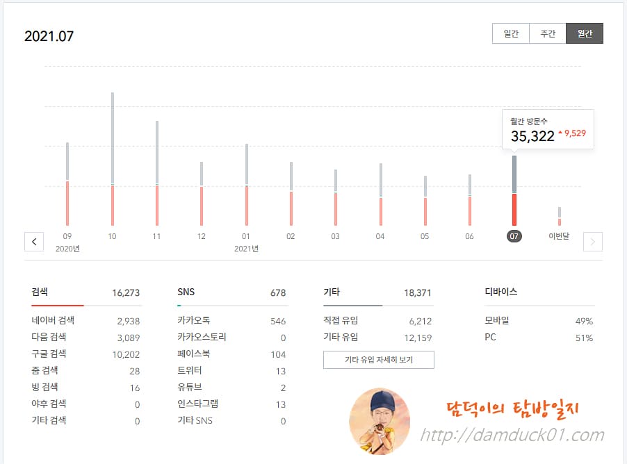 2021년 7월 월간 방문수는 6월보다 9,529나 상승한 35,322를 기록했어요. 3개월 만에 월간 방문수 30,000대를 회복하면서 일 평균 방문 수도 1,140을 기록했습니다. 담덕이의 탐방일지는 아직 다음 메인 등록 없이 일 평균 방문 수 1,000은 힘든 거 같네요.