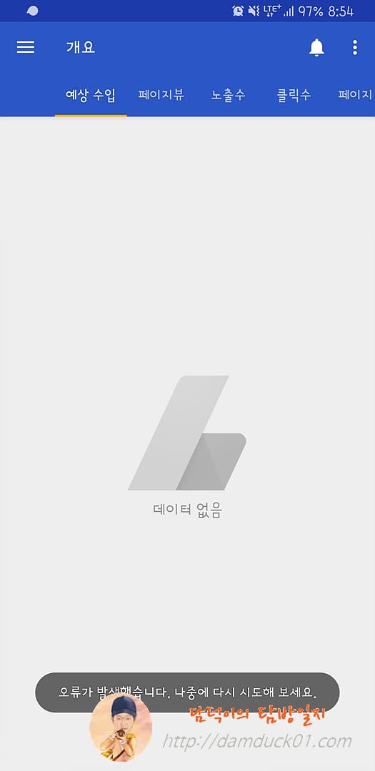 재작년부터 구글 애드센스 앱 지원 중단이 있었습니다. 애드센스 앱을 실행하면 "애드센스에서 수개월 내에 이 앱의 지원이 중단됩니다. 웹 버전을 대신 사용해 주세요."라는 알림이 떴었어요. 그리고 구글 플레이 스토어에서도 검색이 되지 않았습니다. 하지만 저처럼 기존에 설치해서 사용하던 분들은 계속 사용하고 있었을 텐데요. 저도 편하게 사용하기 좋아서 그동안 계속 사용하고 있었고요. 그런데 바로 어제 (2021년 08월 13일) 애드센스 앱을 실행하니까 아래와 같은 메시지가 뜨네요.