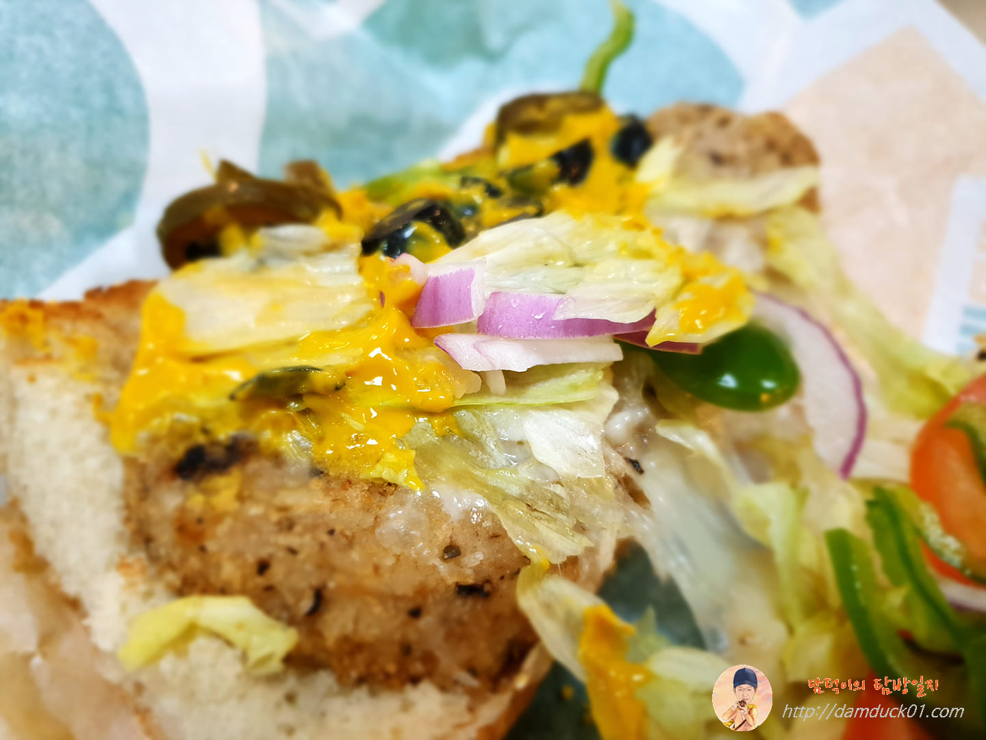 제일 위에 있는 치킨 패티도 생각했던 것보다 괜찮고 다양하게 씹히는 채소도 훌륭합니다.