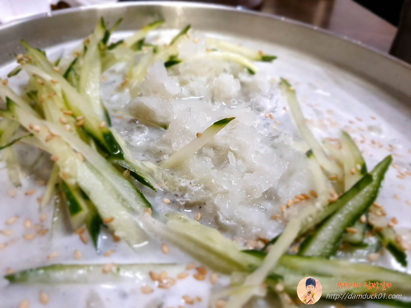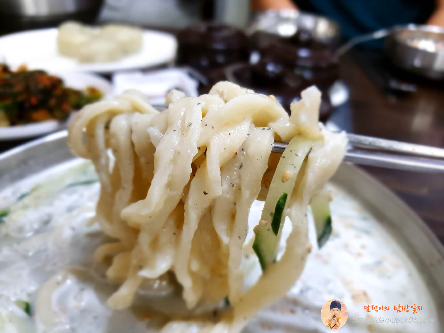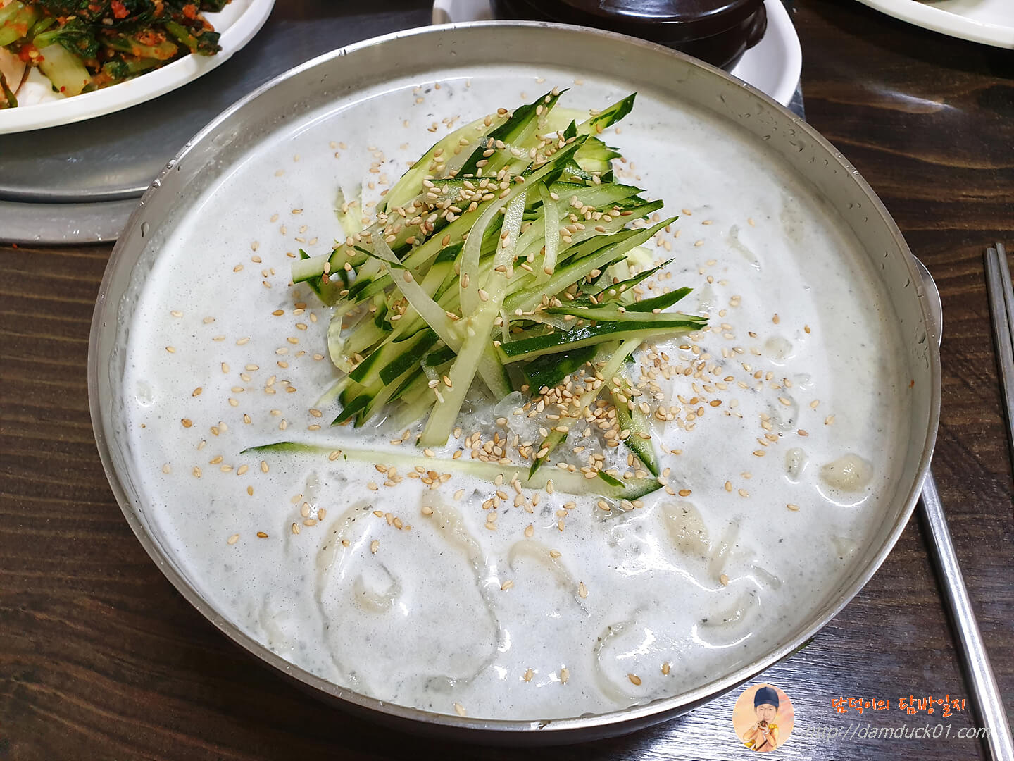 그리고 드디어 주요리인 냉콩칼국수가 도착했습니다. 국물색이 이전에 먹었던 콩국수 하고는 다르네요. 약간 맑은 거 같기도 하고 제가 생각하던 콩국 비주얼이 아니었어요.