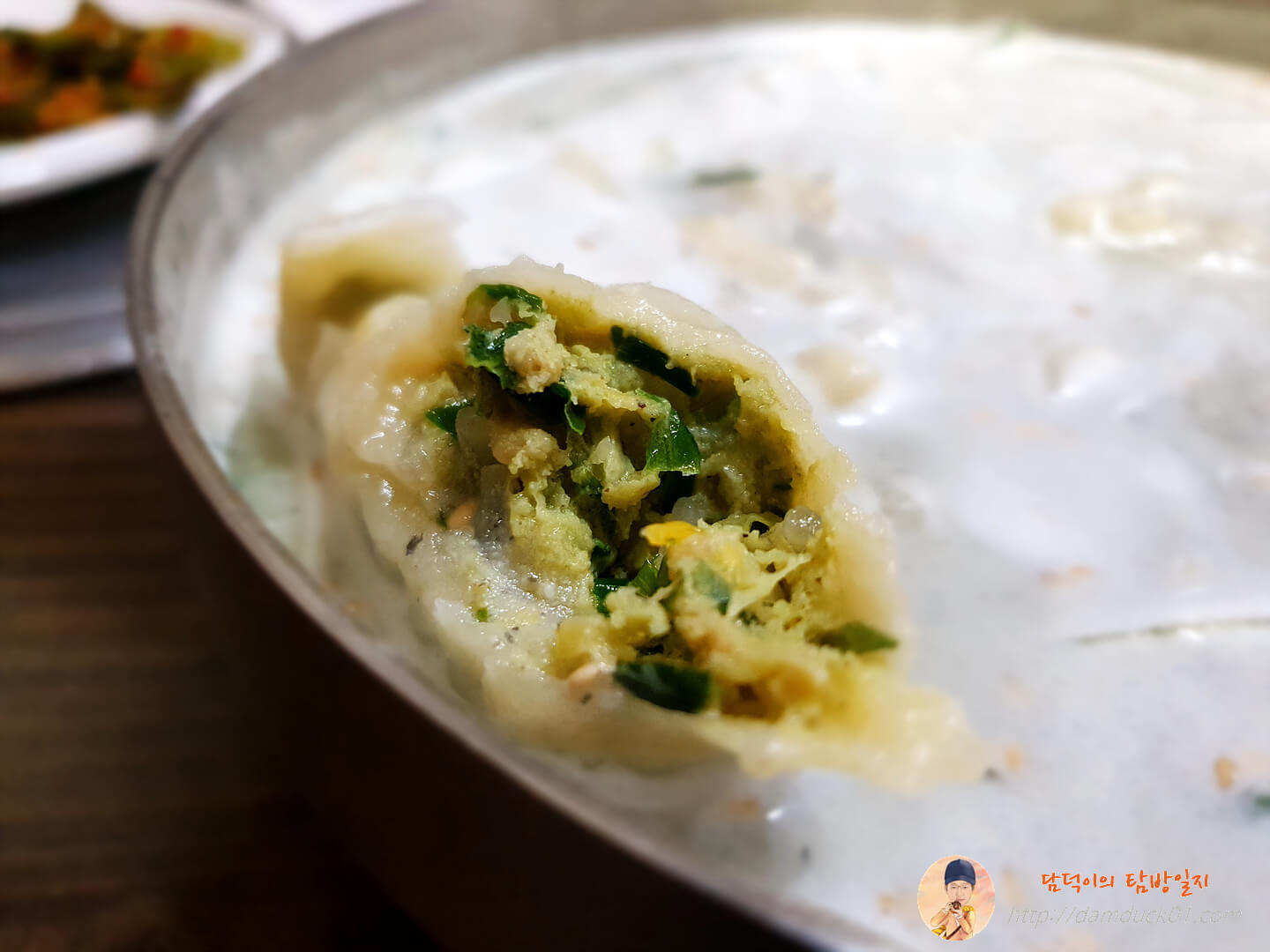 열무 보리 비빔밥을 다 먹었는데 아직 냉콩칼국수는 나오지 않았고 탐방원이 주문한 왕만두가 먼저 나왔습니다. 6,000원인데 만두는 5개. 개당 가격이 1,000원이 넘네요. 그런데 오옹. 이거 왜 맛있죠? 그냥 만두겠지 하고 먹었는데 오호~ 맛있었어요.