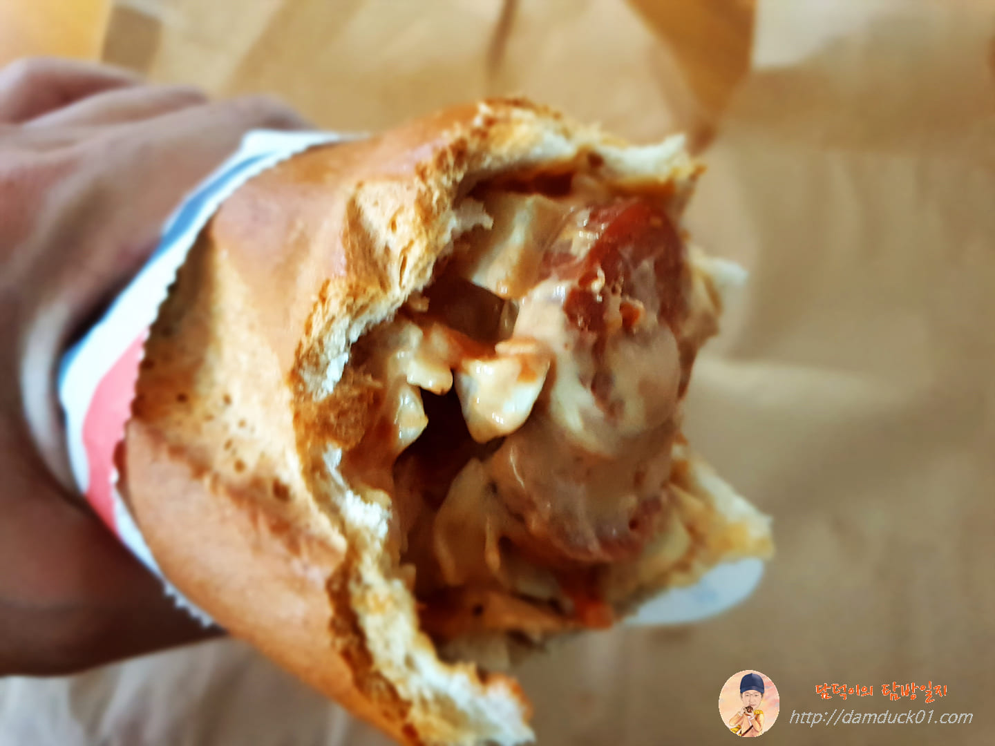 바게트를 반으로 잘라 그 안에 소지지와 양배추 그리고 마요네즈를 기반으로 한 소스가 꾹꾹 눌러 담은 비주얼.